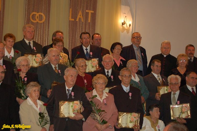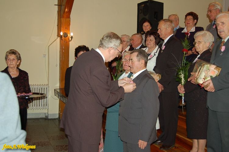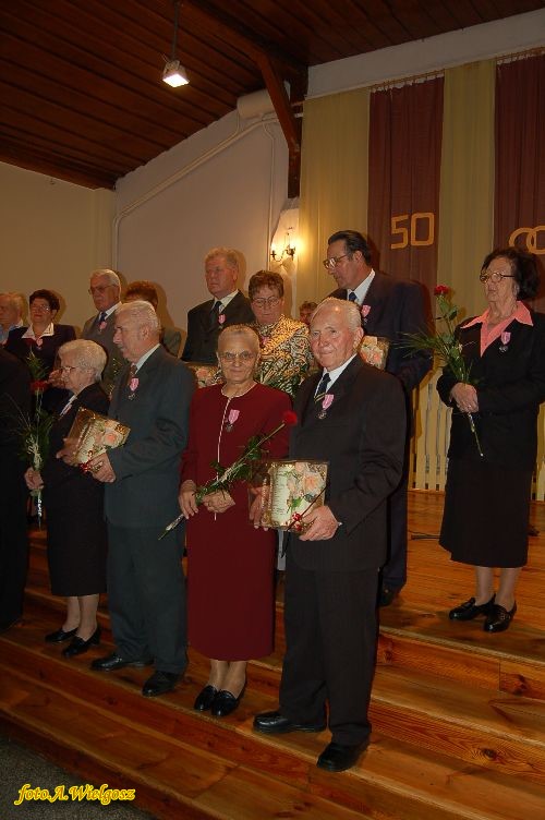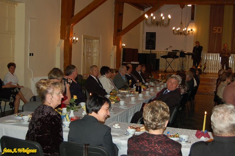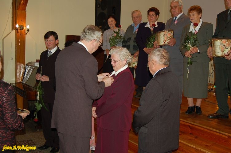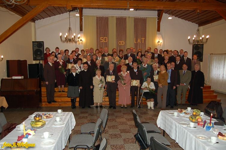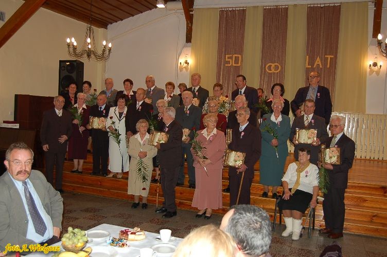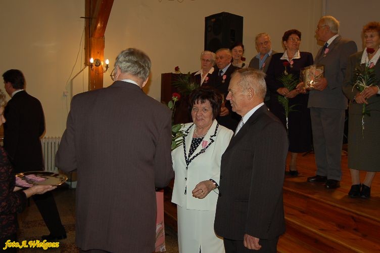 Uroczystość miała charakter gminno-parafialny. Na początku o godz. 12.15 pary obchodzące swoje „Złote Gody” udały się do kościoła po to, aby podziękować Bogu za zgodne pożycie małżeńskie. Msza św. koncelebrowana przez księży naszej parafii ks. kanonika Zdzisława Potrawiaka oraz ks. wikariusza Tomasza Nowaka miała uroczysty charakter, w którym swój udział miał także kaźmierski chór „Moniuszko”. Po mszy ksiądz kanonik w imieniu obecnego na niej wójta dr Wiesława Włodarczaka zaprosił jubilatów na dalszą część uroczystości do Gminnego Ośrodka Kultury. W sali GOK na dostojnych gości i towarzyszące im osoby czekał gospodarz p. Piotr Pospieszny, który powitał przybyłe pary i zaproszonych gości. Obecni byli również przedstawiciele władz gminnych oraz sołtysi wsi, w których na co dzień mieszkają jubilaci. Wójt Gminy Kaźmierz p. Wiesław Włodarczak przywitał jubilatów składając im gratulacje i życzenia dalszych długich lat wspólnego pożycia. „Złotym” jubilatom Prezydent RP przyznał specjalne odznaczenia-medale "Za Długoletnie Pożycie Małżeńskie". Aktu dekoracji dokonał Wójt Gminy Kaźmierz w towarzystwie byłej (emerytowanej) kierowniczki USC p. Wandy Krystkowiak oraz obecnej kierowniczki USC p. Lucyny Gawłowskiej. Dodatkowo każda z par otrzymała kwiatek i upominek. Po dekoracji przyszedł czas na wspólny toast, po którym nastąpiła część artystyczna. W tej części swoim muzycznym talentem popisali się panowie Piotr Pospieszny i Waldemar Hermann pracownicy GOK, którzy wspólnie zagrali kilka utworów dla zebranych gości. W dalszej części artystycznej wystąpił coraz popularniejszy w naszej gminie i nie tylko zespół „Kaźmierzanka”. Zespół przypomniał popularne piosenki biesiadne, wśród których nie zabrakło i tych, które grane były na weselach przed pięćdziesięciu laty. Swoje umiejętności gry na instrumentach klawiszowych zaprezentował Bartek Dolata, wykonując utwory na pianinie. Wszyscy uczestnicy uroczystości z wielką uwagą słuchali muzyki i piosenek popijając przy tym kawę i zajadając się tortem oraz innymi słodyczami, o które zadbała p. Lucyna Gawłowska. Wspomnieć należy, że po raz kolejny przy organizacji tego typu imprezy nie zabrakło pań z naszej Publicznej Biblioteki, które wspomagały organizatorów w przygotowaniu poczęstunku. Na zakończenie wszyscy dostojni jubilaci wpisali się do „Księgi Pamiątkowej”. Miejmy nadzieję, że te chwile spędzone wspólnie z przedstawicielami naszych lokalnych władz i kościoła na długo pozostaną w pamięci ich uczestników.