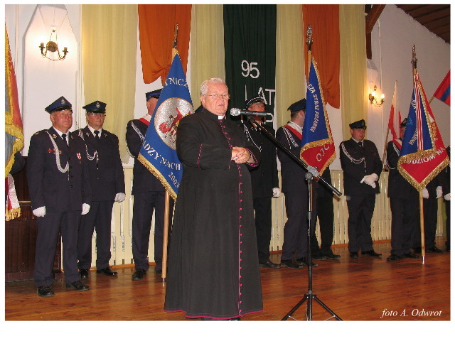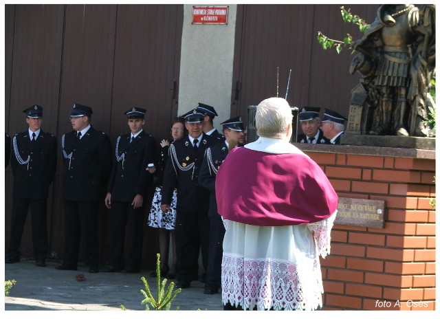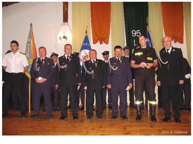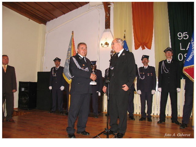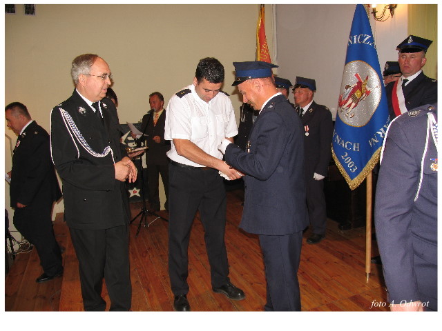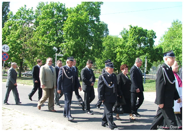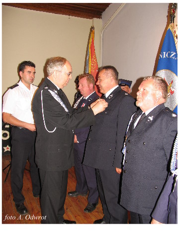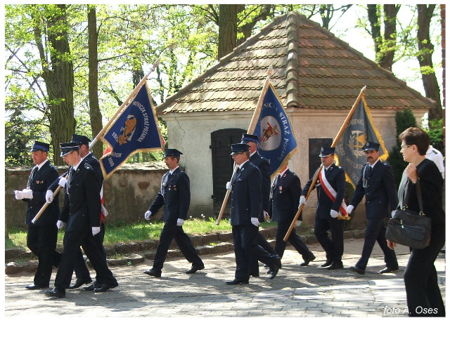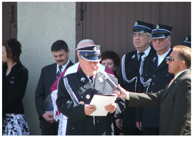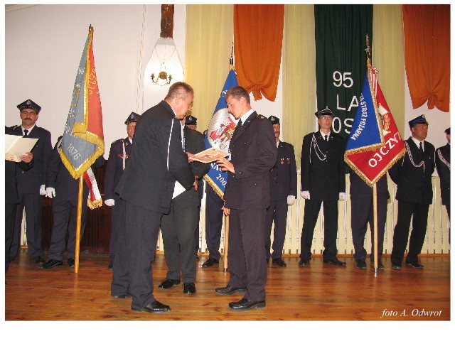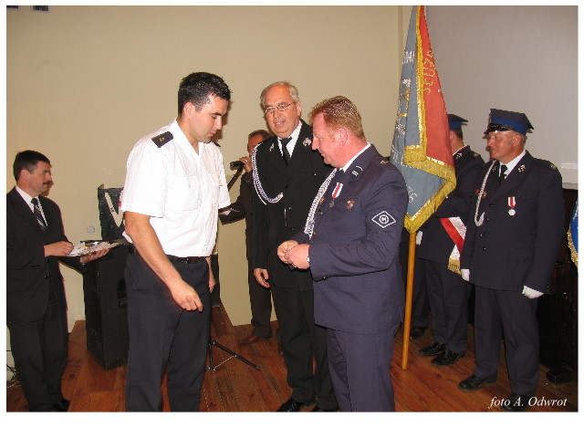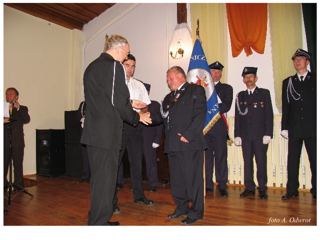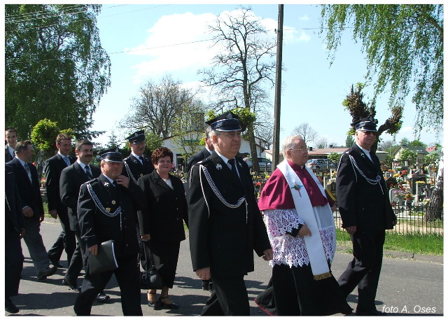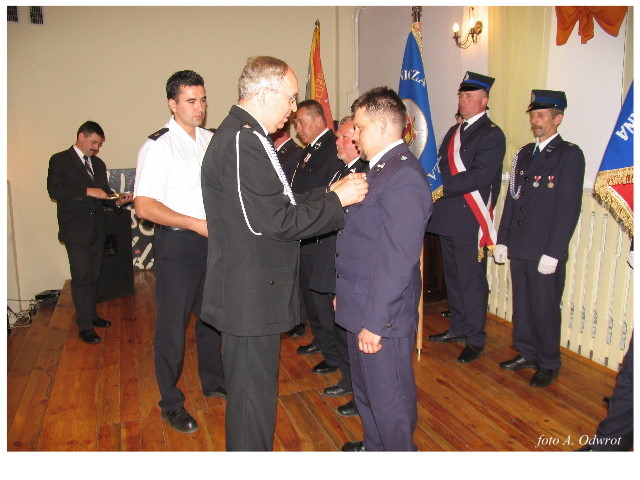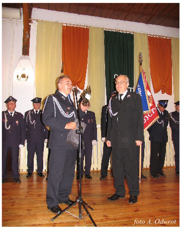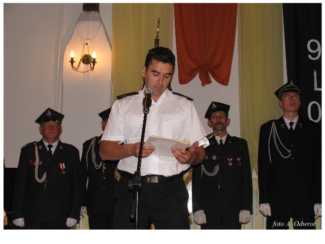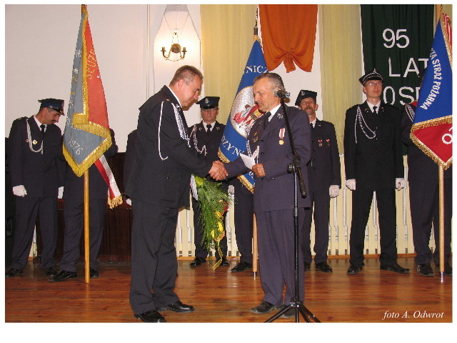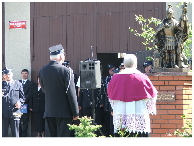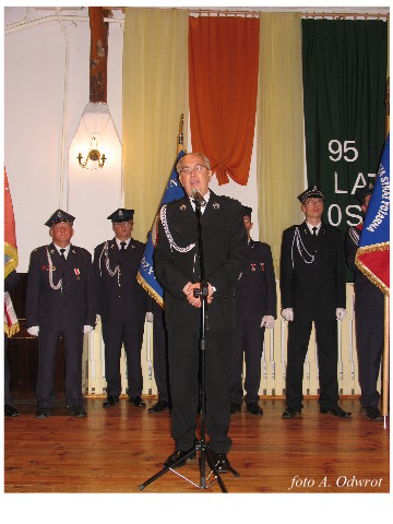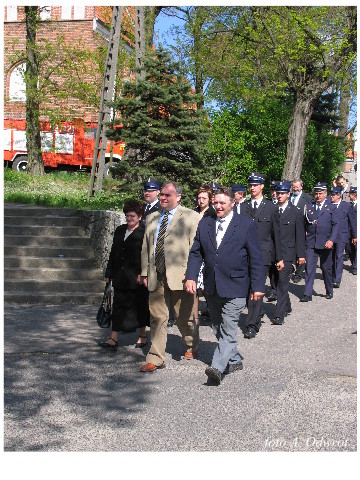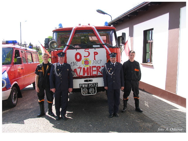 Często bywało to zabawne, bo ubierali się po drodze cały czas biegnąc. Innym razem znowu któryś spadał z roweru, kiedy w butach gumowych próbował na niego wsiąść. Jednak najbardziej mnie urzekało to, że zawsze, jak tylko byli w domach to, błyskawicznie reagowali na dźwięk syren. Bywało, że zrywali się z pracy, aby pomagać innym. Dziś żaden z wymienionych przeze mnie strażaków już nie żyje. Ilu ludzi zawdzięcza im to, że nie stracili majątku lub życia? Nie wiadomo, bo tego nikt już nie pamięta. Mam nadzieję, że ci, którym pomogli znajdują chwilkę czasu na to, aby zatrzymać się na moment nad ich mogiłami. Główne uroczystości obchodów 95-tej rocznicy odbyły się już 5-tego maja tego roku. Uroczystość zapoczątkowało poświęcenie nowej figury patrona św. Floriana. Aktu tego dokonali, proboszcz naszej parafii ks. kan. Zdzisław Potrawiak i zaproszony na uroczystości kapelan strażaków z Szamotuł ks. kan. Andrzej Grabański. Na uroczystość przybyły poczty sztandarowe z jednostek OSP z Gminy Kaźmierz oraz zaproszeni goście w osobach przedstawicieli zarządów gminnych i powiatowych OSP. Sekretarz OSP Kaźmierz druh Zenon Pawlaczyk odczytał treść dokumentów, które zostały wmurowane w cokół pomnika wraz z Aktem Erekcyjnym. Na cokole umieszczono napis: „BOGU NA CHWAŁĘ LUDZIOM NA RATUNEK” Kolejnym punktem uroczystości była msza święta w intencji strażaków w kaźmierskim kościele, dokąd wszyscy zebrani udali się przy dźwiękach muzyki wykonanej przez orkiestrę z Pniew. Po mszy celebrowanej przez ks. kan. Andrzeja Grabarskiego strażacy oraz zaproszeni na uroczystość goście udali się do sali GOK gdzie po wprowadzeniu sztandarów i odśpiewaniu hymnu rozpoczęła się dalsza część uroczystości. Jako pierwszy głos zabrał gospodarz prezes OSP Kaźmierz druh Grzegorz Skabara, który powitał przybyłych gości. Druh Zenon Pawlaczyk przytoczył fragmenty z historii kaźmierskiej jednostki, po czym głos zabrali goście, składając naszym strażakom życzenia i gratulacje z okazji jubileuszu. Kolejnym miłym dla wszystkich strażaków aktem było wręczenie dyplomów, odznak i medali za zasługi dla pożarnictwa. Chociaż strażacy nie wykonują swojej pracy dla medali to nie ma wątpliwości, iż cieszą się z tego, że społeczeństwo dostrzega ich poświęcenie. Odznaczenia nadane druhom wręczył prezes Zarządu Oddziału Powiatowego Związku OSP RP w Szamotułach dh Wiesław Włodarczak wraz z przedstawicielem Państwowej Straży Pożarnej w Szamotułach mł. kap. Romanem Muchą dowódcą Szamotulskiej Jednostki Ratowniczo Gaśniczej.