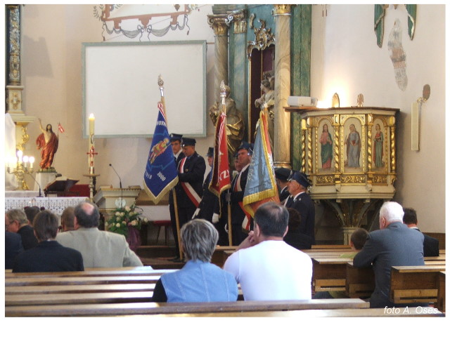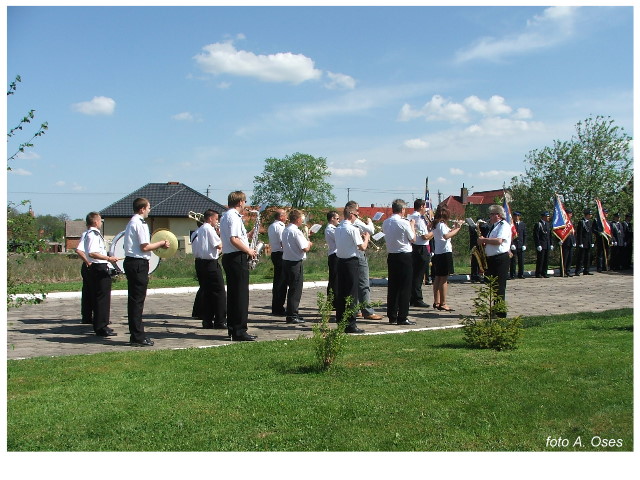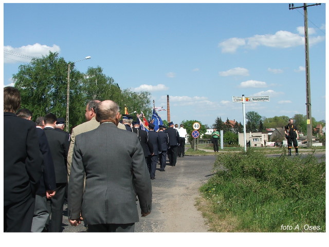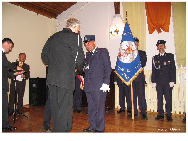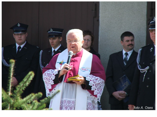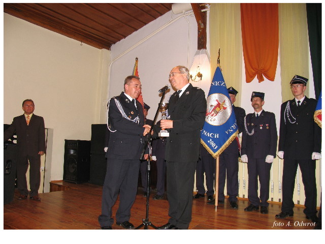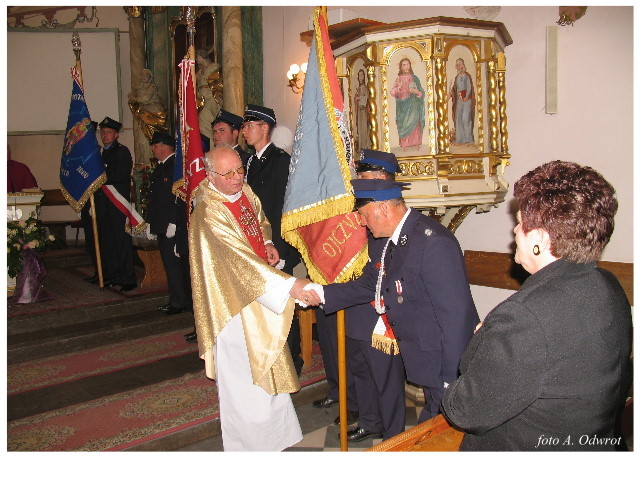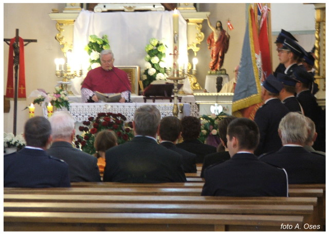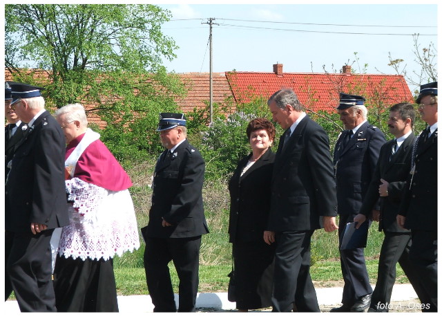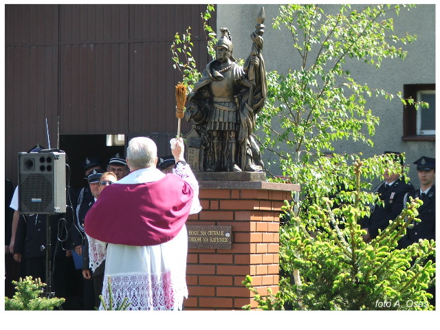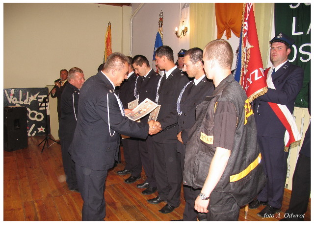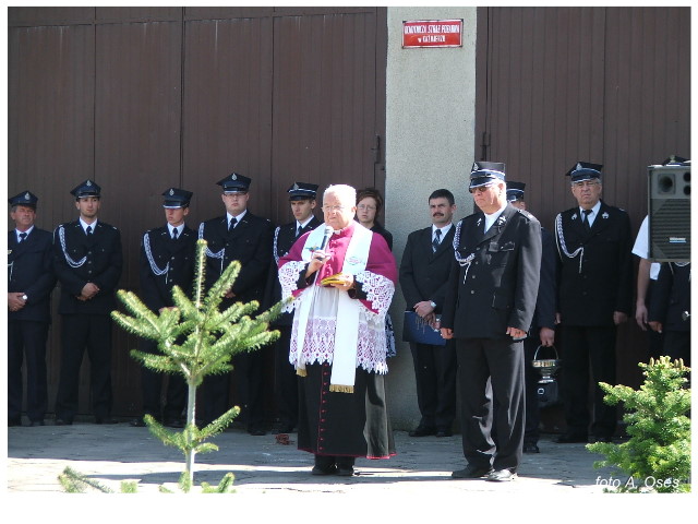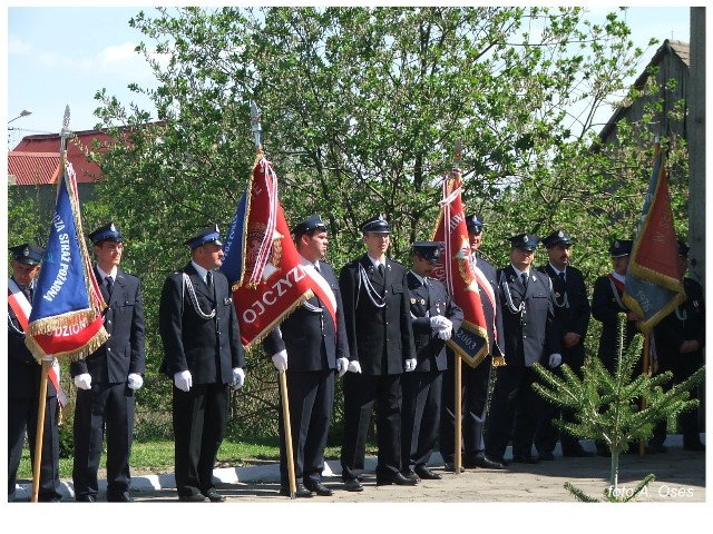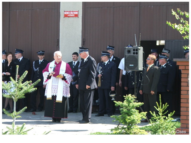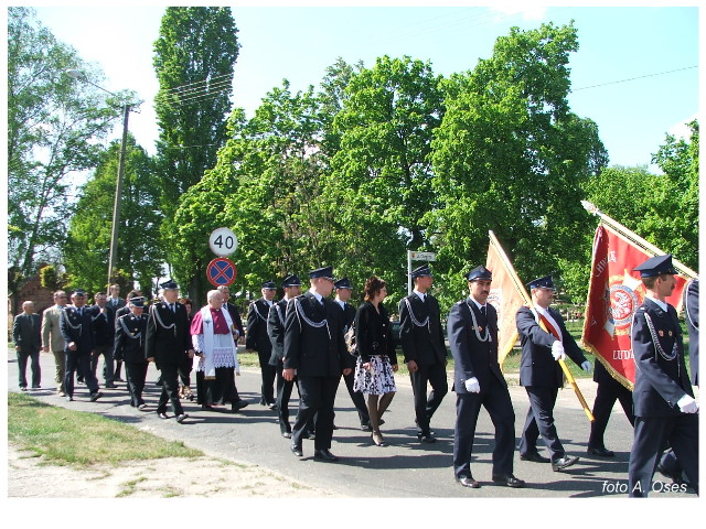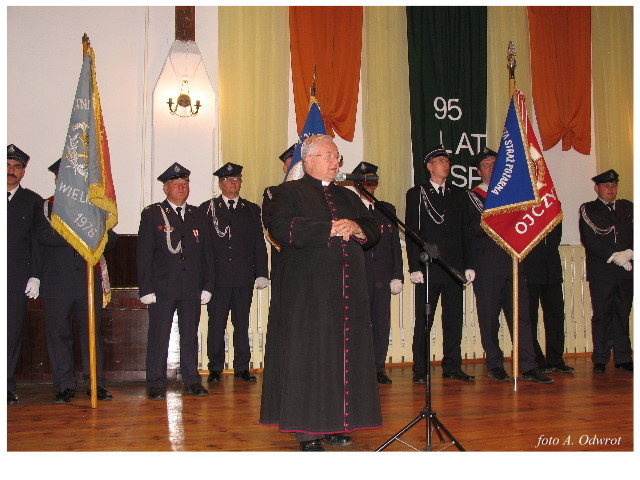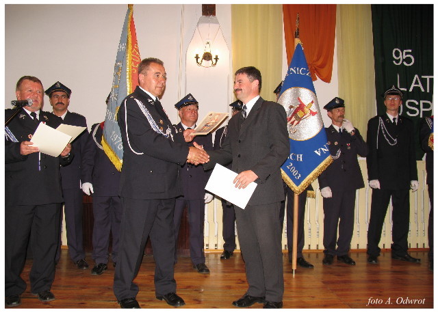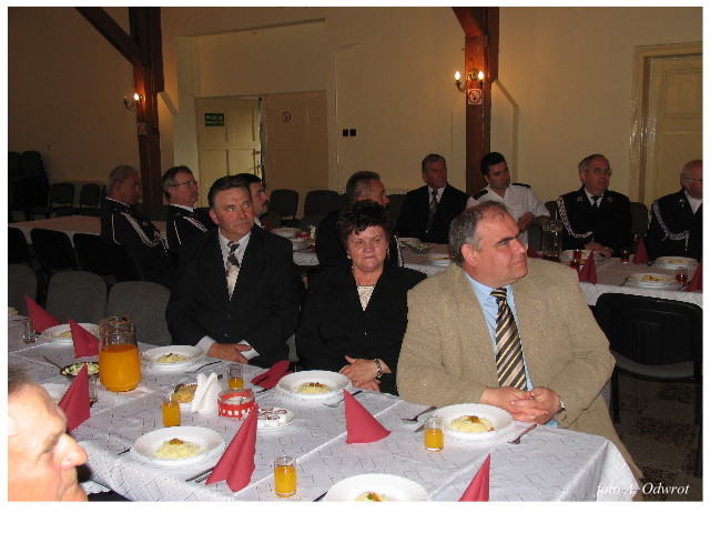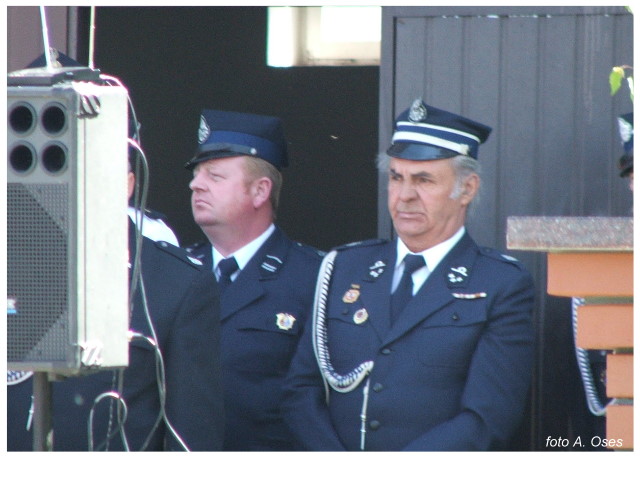 Często bywało to zabawne, bo ubierali się po drodze cały czas biegnąc. Innym razem znowu któryś spadał z roweru, kiedy w butach gumowych próbował na niego wsiąść. Jednak najbardziej mnie urzekało to, że zawsze, jak tylko byli w domach to, błyskawicznie reagowali na dźwięk syren. Bywało, że zrywali się z pracy, aby pomagać innym. Dziś żaden z wymienionych przeze mnie strażaków już nie żyje. Ilu ludzi zawdzięcza im to, że nie stracili majątku lub życia? Nie wiadomo, bo tego nikt już nie pamięta. Mam nadzieję, że ci, którym pomogli znajdują chwilkę czasu na to, aby zatrzymać się na moment nad ich mogiłami. Główne uroczystości obchodów 95-tej rocznicy odbyły się już 5-tego maja tego roku. Uroczystość zapoczątkowało poświęcenie nowej figury patrona św. Floriana. Aktu tego dokonali, proboszcz naszej parafii ks. kan. Zdzisław Potrawiak i zaproszony na uroczystości kapelan strażaków z Szamotuł ks. kan. Andrzej Grabański. Na uroczystość przybyły poczty sztandarowe z jednostek OSP z Gminy Kaźmierz oraz zaproszeni goście w osobach przedstawicieli zarządów gminnych i powiatowych OSP. Sekretarz OSP Kaźmierz druh Zenon Pawlaczyk odczytał treść dokumentów, które zostały wmurowane w cokół pomnika wraz z Aktem Erekcyjnym. Na cokole umieszczono napis: „BOGU NA CHWAŁĘ LUDZIOM NA RATUNEK” Kolejnym punktem uroczystości była msza święta w intencji strażaków w kaźmierskim kościele, dokąd wszyscy zebrani udali się przy dźwiękach muzyki wykonanej przez orkiestrę z Pniew. Po mszy celebrowanej przez ks. kan. Andrzeja Grabarskiego strażacy oraz zaproszeni na uroczystość goście udali się do sali GOK gdzie po wprowadzeniu sztandarów i odśpiewaniu hymnu rozpoczęła się dalsza część uroczystości. Jako pierwszy głos zabrał gospodarz prezes OSP Kaźmierz druh Grzegorz Skabara, który powitał przybyłych gości. Druh Zenon Pawlaczyk przytoczył fragmenty z historii kaźmierskiej jednostki, po czym głos zabrali goście, składając naszym strażakom życzenia i gratulacje z okazji jubileuszu. Kolejnym miłym dla wszystkich strażaków aktem było wręczenie dyplomów, odznak i medali za zasługi dla pożarnictwa. Chociaż strażacy nie wykonują swojej pracy dla medali to nie ma wątpliwości, iż cieszą się z tego, że społeczeństwo dostrzega ich poświęcenie. Odznaczenia nadane druhom wręczył prezes Zarządu Oddziału Powiatowego Związku OSP RP w Szamotułach dh Wiesław Włodarczak wraz z przedstawicielem Państwowej Straży Pożarnej w Szamotułach mł. kap. Romanem Muchą dowódcą Szamotulskiej Jednostki Ratowniczo Gaśniczej.