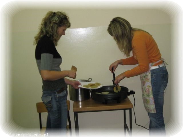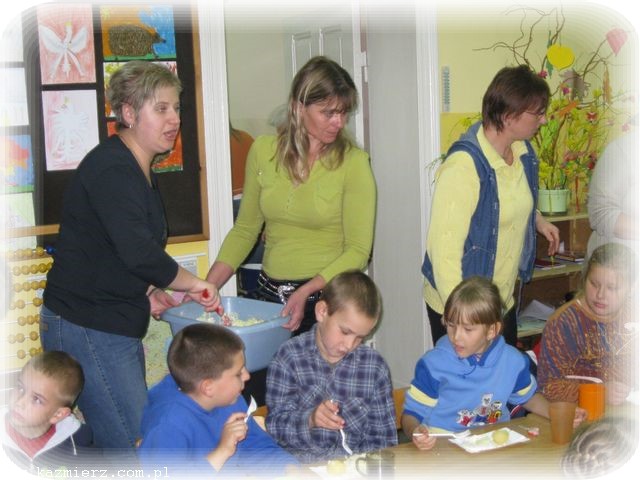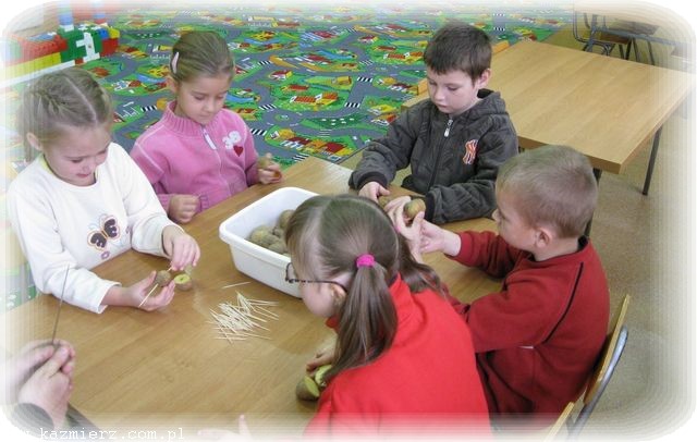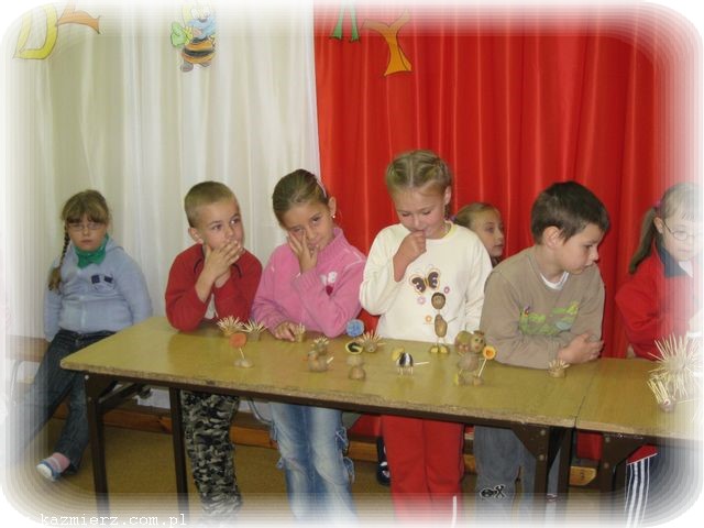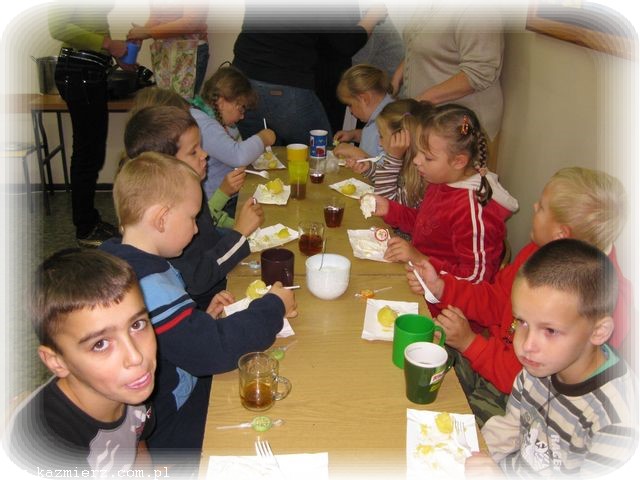 Bo to przecież prawdziwa przyjemność uczestniczyć w zajęciach tak różnych od codziennych! Dzień 3.10.2009 nie rozpieszczał nas pogodą, więc większość zajęć odbywała się w szkole. Klasa III zapoznała nas z historią ziemniaka, a historia to pasjonująca, bo sięgająca kilkaset lat wstecz. Na ziemiach polskich uprawa ziemniaków, początkowo jako roślin ozdobnych, najprawdopodobniej zaczęła się od króla Jana III Sobieskiego. Ale w chwili obecnej ziemniaki są już tak rozpowszechnione, ze dzieci bez trudu potrafiły wymienić potrawy, które z nich się sporządza. Największą popularnością wśród dziatwy cieszyły się oczywiście frytki, ale wiedza na temat innych potraw też była imponująca.