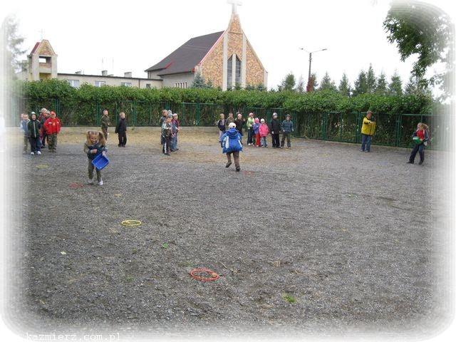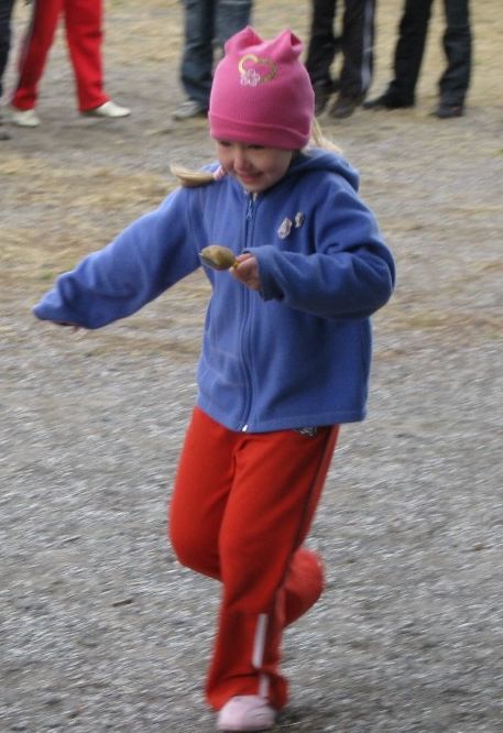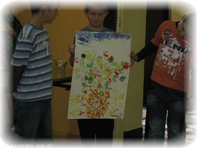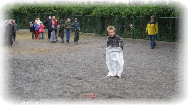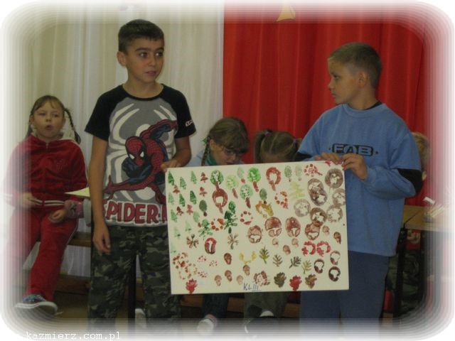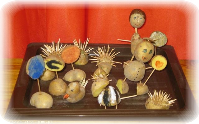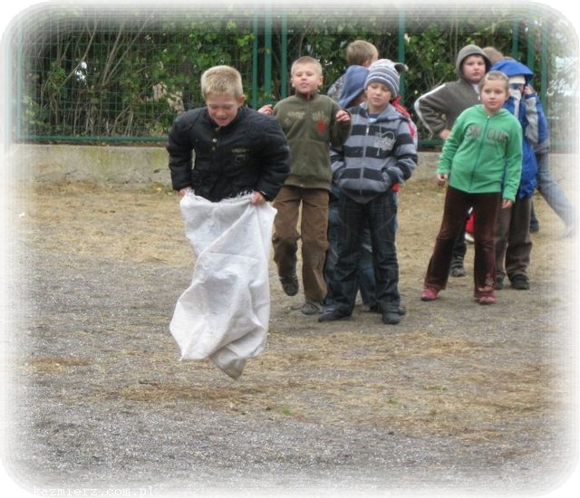 Po odśpiewaniu znanej już piosenki ‘Ziemniaczek’ uczniowie rozeszli się do swoich klas, gdzie pod okiem swoich pań przygotowywali prace plastyczne z wykorzystaniem ziemniaków. Pierwszaki i przedszkolaki wykonały wspaniałe pyrkowe cudaki, wśród których rozpoznać można było i naszego rodzimego jeża, i robota, i stworki zupełnie fantastyczne. Natomiast klasy II i III, jako że posiadły już umiejętność korzystania z noża, wycinały stempelki z ziemniaków, a potem przy ich pomocy wykonały wspaniałe prace o tematyce jesiennej. Po wspólnym obejrzeniu prac, korzystając z tego, że deszcz jeszcze nie zaczął padać, wyszliśmy na boisko rozegrać konkurencje – a jakże! - ziemniaczane. Był więc slalom z ziemniakiem na łyżce, rzuty ziemniakami do celu, skoki w workach (zapewne po pyrkach) i wiele innych konkurencji. Wszystkie dzieci dzielnie walczyły, aby zdobyć jak najwięcej punktów dla swojej klasy. Taka dawka emocji i wysiłku fizycznego wzmogła apetyty.