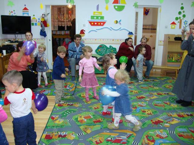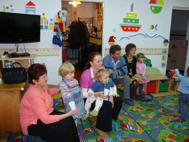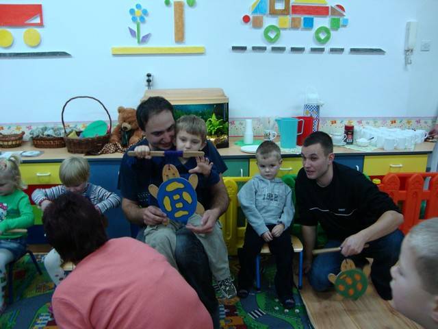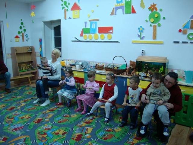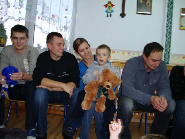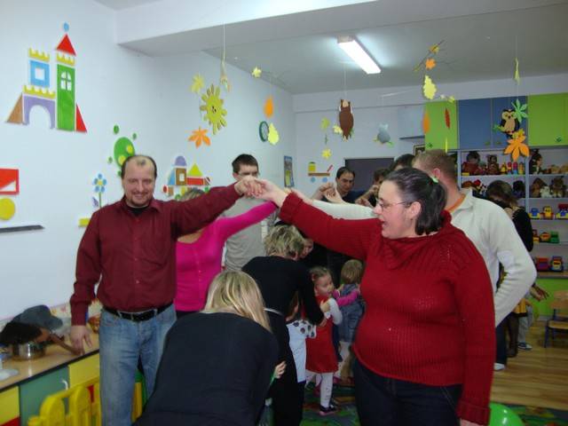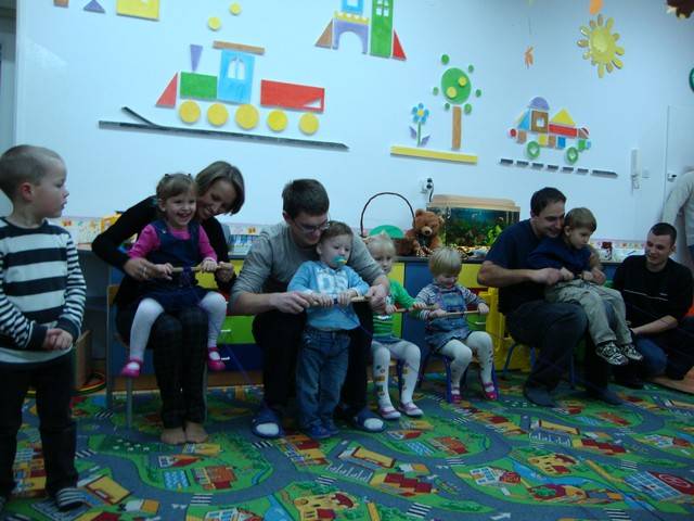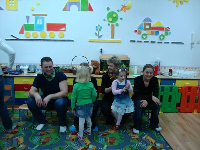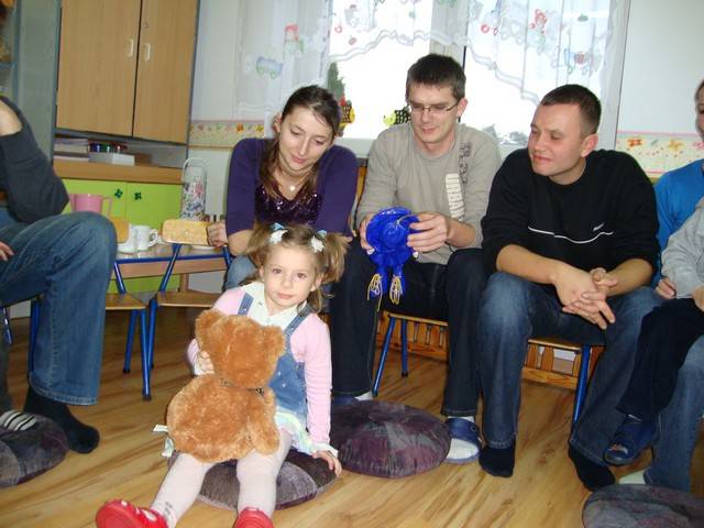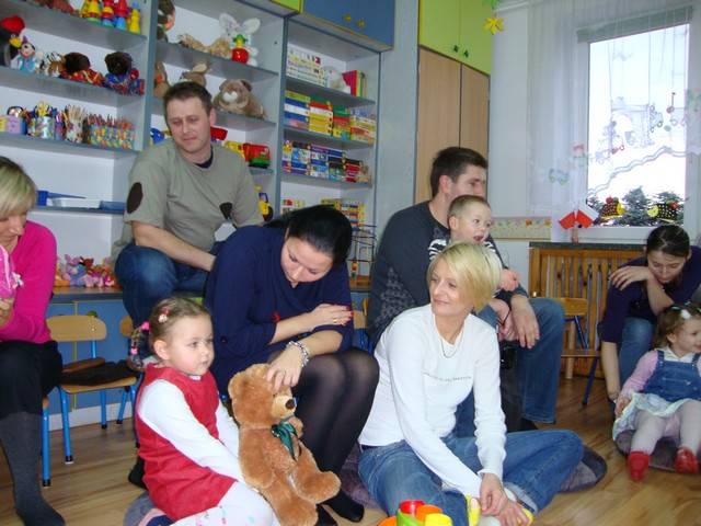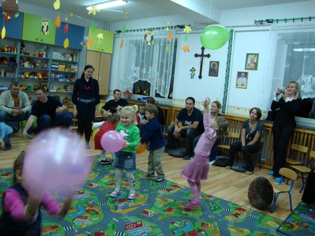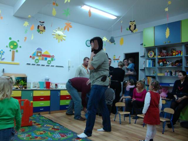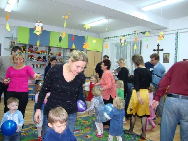 Niedzielne popołudnie 22 listopada maluchy z przedszkola Sióstr Urszulanek w Sokolnikach Wielkich spędziły razem ze swymi rodzicami. Spotkanie zostało zorganizowane w przedszkolu, ponieważ to miejsce znają wszyscy doskonale i nawet te najmniejsze osóbki zdążyły się już z nim oswoić przychodząc tu codziennie od września. W ten sposób chcieliśmy poznać się bliżej i pokazać, że dorośli potrafią się bawić wespół ze swymi pociechami. Rozpoczęliśmy naszą integrację od przedstawienia się nawzajem. Dzieci trzymając pluszowego misia mówiły swoje imię oraz z kim przyszły na spotkanie - wskazywały na swoich kochanych rodziców, rodzeństwo oraz babcie. Dalszym punktem programu były wspólne tańce i zabawy ze śpiewem. Nie zabrakło na ten przykład tradycyjnej zabawy w "Kotka i myszkę", gdzie dziecko goniło rodzica lub odwrotnie kot - rodzic gonił dziecko- myszkę. Wielkim entuzjazmem cieszył się taniec z wiewióreczką, podczas którego dzieci uczyły rodziców kolejnych kroków.