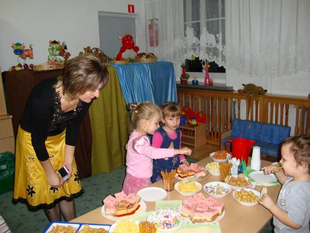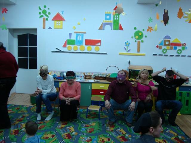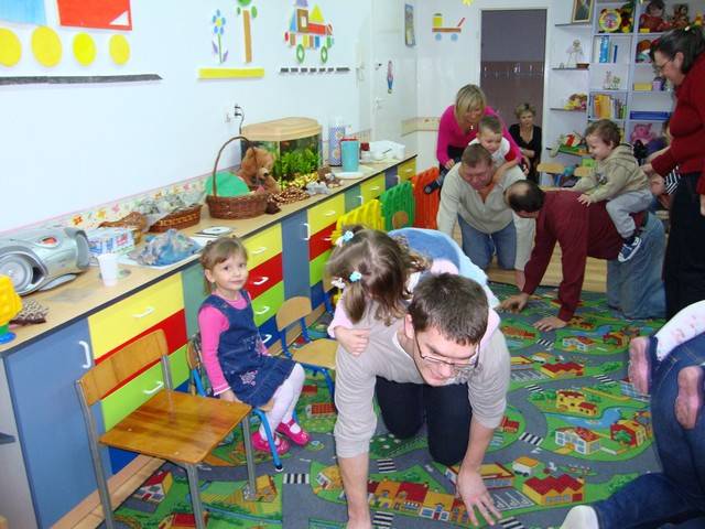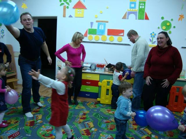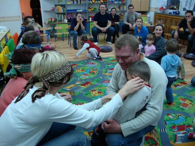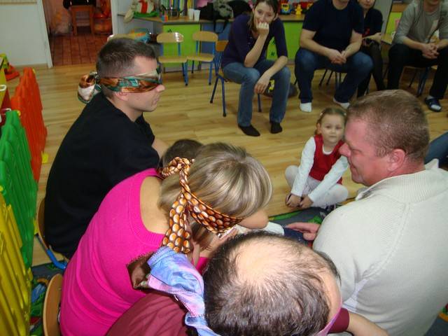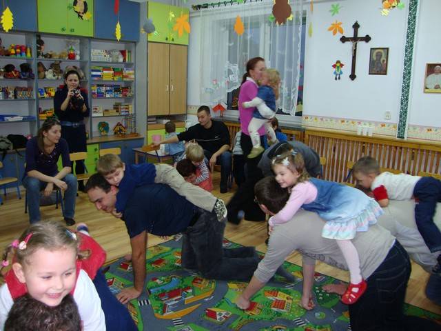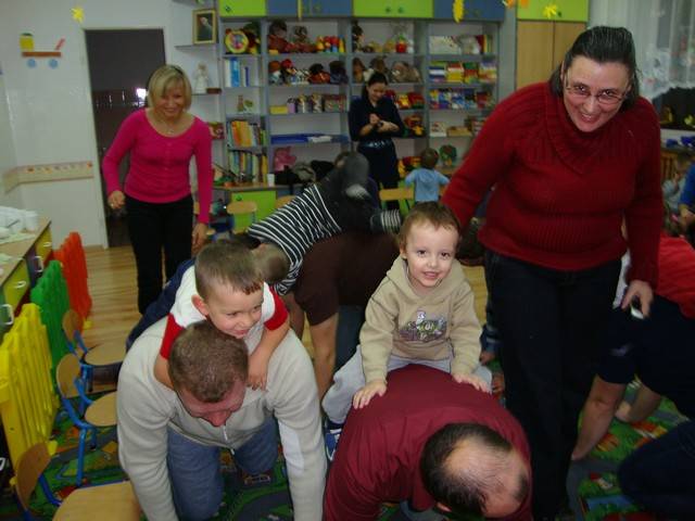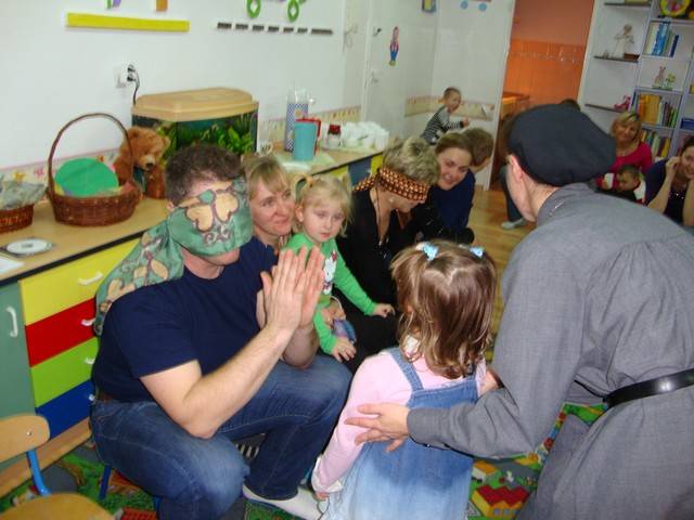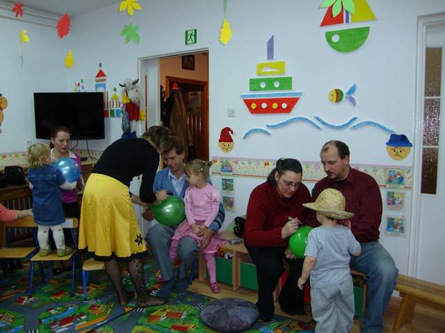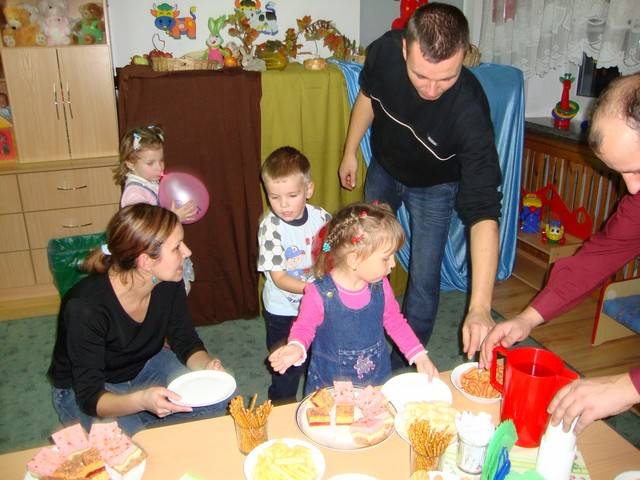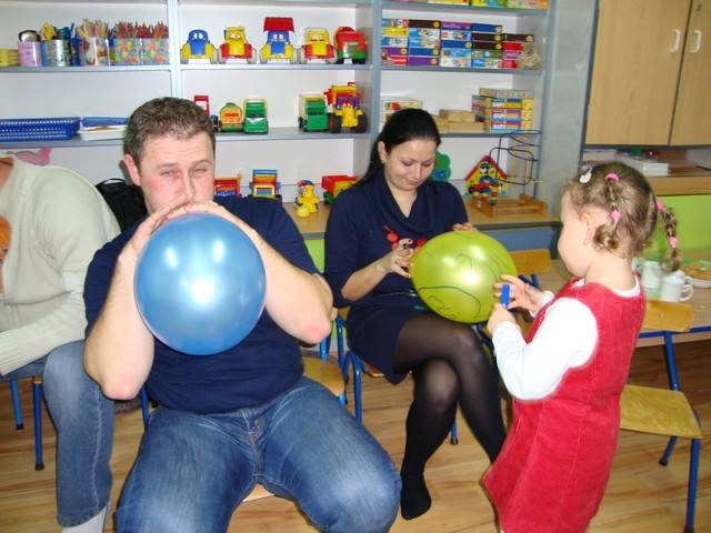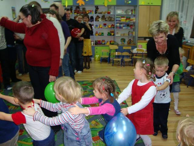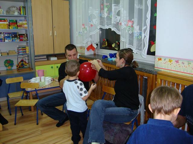 Następnie przystąpiliśmy do konkursów, w czasie których rodzic z zamkniętymi oczyma musiał odnaleźć swoje dziecko. Niezapomniana dla dzieci będzie również przejażdżka na koniku, czy też wyścigi wiewiórek, gdzie dziecko na ramionach rodzica pędziło do dziupli, by tam wrzucić orzeszek. W czasie wspólnej wesołej zabawy przerywnik stanowiła bajka o kłopotach „Burka” z podwórka. Aktorami byli najpierw rodzice, którzy bez próby na żywo ciekawie przedstawili dzieciom kłopoty „Burka”. Następnie dzieci podjęły się roli aktorów i w ciekawy sposób pokazały rodzicom swoje umiejętności teatralne. Pod koniec uczestnicy spotkania otrzymali baloniki, na których pojawiły się imiona oraz roześmiane twarze dzieci malowane własnoręcznie przez gości. I w tym przypadku zabawy i śmiechu było bez liku i tak miło upłynął nam czas, że po słodkim poczęstunku trudno nam było się rozstać.
