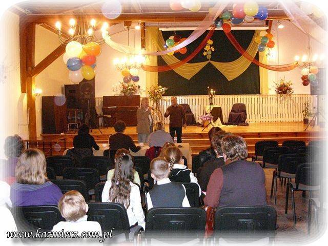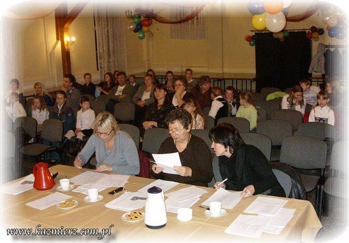Piotr Pospieszny - dyrektor GOK jako pierwszy zabrał głos i w kilku słowach przywitał audytorium oraz przybliżył klimat tego poetyckiego spotkania. Natomiast Pan Waldemar Herman sprawdził listę obecności wykonawców i omówił króciutko sprawy techniczne związane z konkursem. Nie można w tej relacji oczywiście zapomnieć o komisji oceniającej poszczególne prezentacje. Do jej grona zaproszono trzy Panie. Pierwsza z nich to Aleksandra Słomińska z Szamotulskiego Ośrodka Kultury, która sama wielokroć organizowała podobnego typu imprezy w Szamotułach. Kolejnymi jurorkami zostały panie Janina Łuczak i Barbara Kubiak. Obie panie są dobrze znane Kaźmierzanom, bowiem przez wiele lat swej pracy mocno związały się ze środowiskiem szkolnym naszej gminy. Po prezentacji i omówieniu spraw technicznych rozpoczęła się cześć konkursowa. Recytacje przeprowadzono w trzech grupach wiekowych. Klasy 1-3 zaprezentowały wiersz natomiast klasy 4- 6 oraz gimnazjaliści - wiersz i prozę.