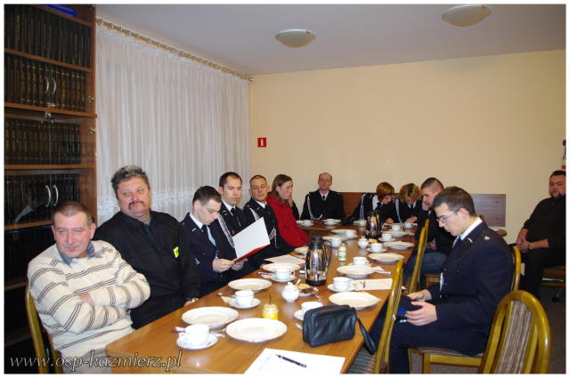 Na zebraniu przyjęto 5 nowych członków. W okresie sprawozdawczym zaszły zmiany w zarządzie kaźmierskiej jednostki. Z funkcji skarbnika ze względu na objęcie nowej funkcji z-cy wójta Gminy Kaźmierz zrezygnował dh Marek Jakubowski. Na nowego skarbnika wybrany został dh Roman Graczyk. Ze sprawozdań dowiedzieliśmy się również, że druhowie z OSP Kaźmierz w roku 2011 uczestniczyli 114 razy w akcjach ratowniczych w tym: gaszenie pożarów 18 razy i likwidacja zagrożeń miejscowych 96 razy. Strażacy uczestniczyli również 7 razy w akcjach poza terenem naszej gminy. W dalszej części głos zabrali zaproszeni goście, którzy pozytywnie wyrażali się o kaźmierskich ochotnikach. Kapitan Roman Mucha z PSP w Szamotułach bardzo wysoko ocenił umiejętności naszych strażaków. W ostatnim czasie jednostka z Kaźmierza została doposażona w specjalistyczny sprzęt niezbędny do ratowania ludzi spod lodu. Są to specjalistyczne sanie lodowe, których obsługę ćwiczono 10 lutego 2012 na zalewie Radzyny. Ćwiczenia odbywały się pod okiem strażaków z Jednostki Ratowniczo-Gaśniczej z Szamotuł. Kaźmierscy strażacy posiadający coraz to nowocześniejszy sprzęt i zdobywający niezbędne doświadczenia są obecnie, bardzo mocnym wsparciem dla zawodowych grup ratunkowych.
