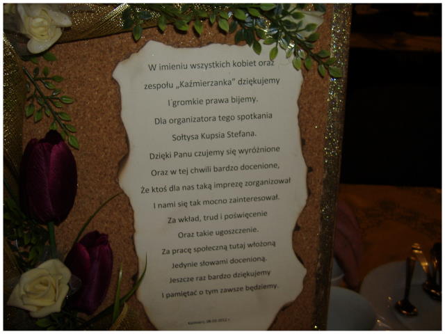 Gospodarz sołectwa Kaźmierz p. Stefan Kupś, zapraszając wszystkie panie do sali Gminnego Ośrodka Kultury z okazji Dnia Kobiet, nie spodziewał się, chyba że aż tak wiele mieszkanek odpowie na to zaproszenie. Do tej pory w sołectwie nie było tradycji obchodów tego święta, poza imprezami organizowanymi przez GOK. Być może dlatego nasze panie odczuwały potrzebę uczestniczenia w spotkaniu, które miało miejsce 8 marca 2012 r. Brak wolnych miejsc przy stołach nie przeraził organizatorów spotkania, a wręcz przeciwnie uświadomił im, że tego typu imprezy są przez społeczeństwo akceptowane.