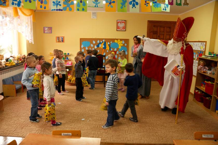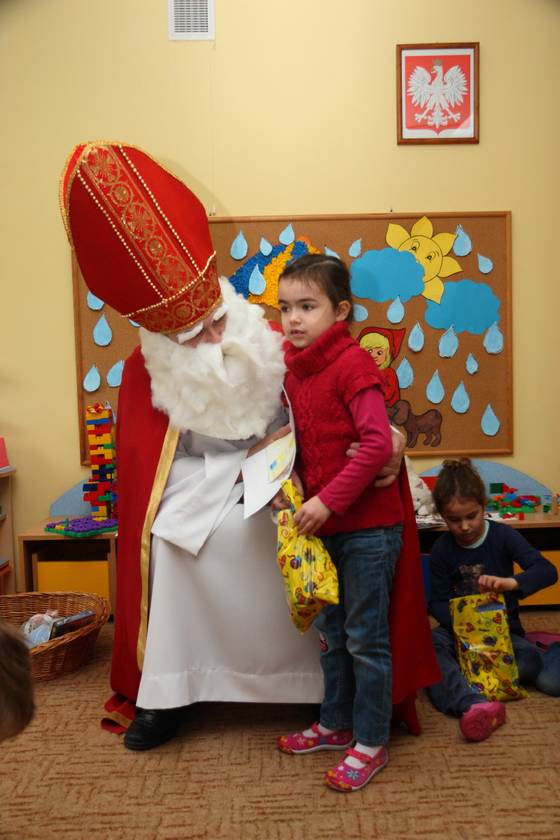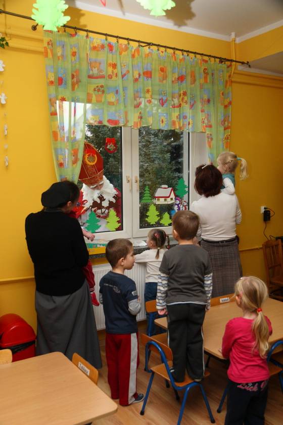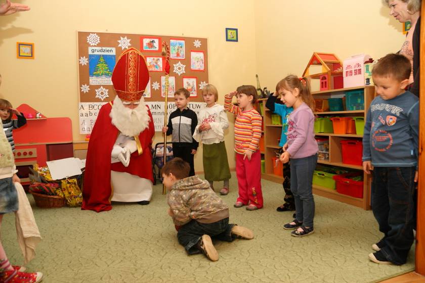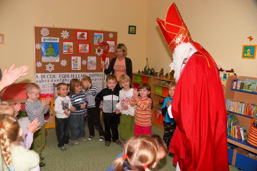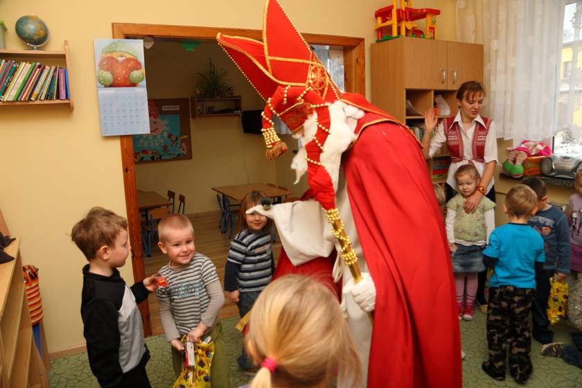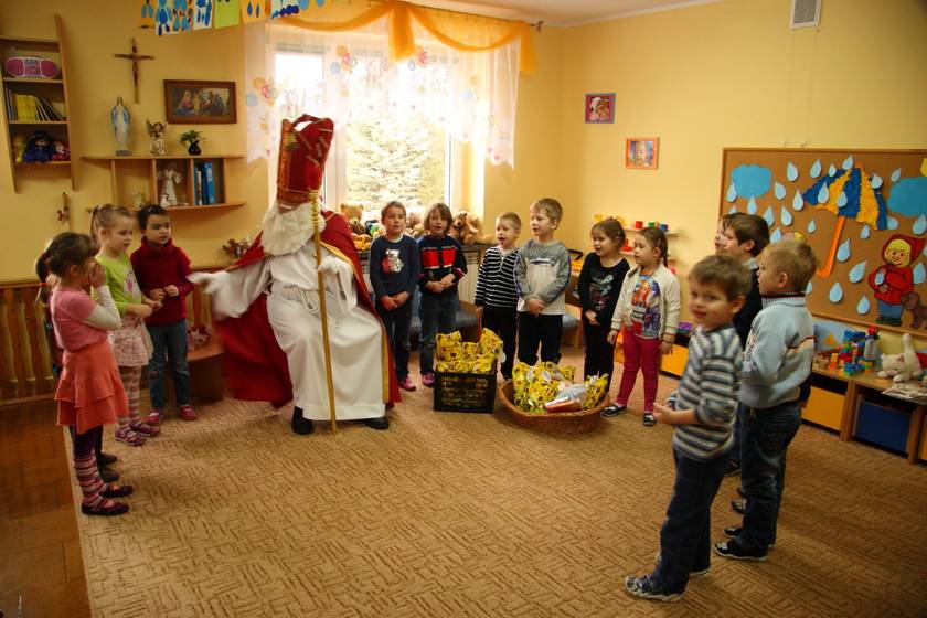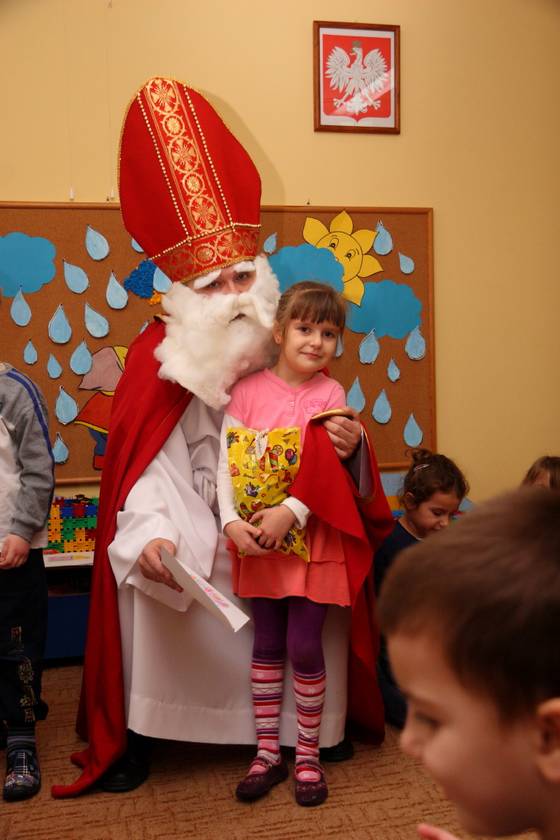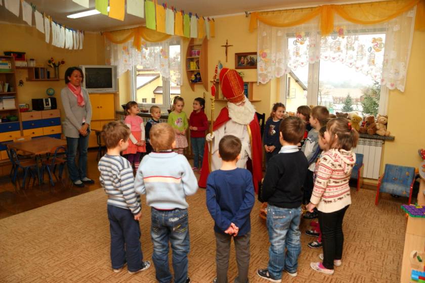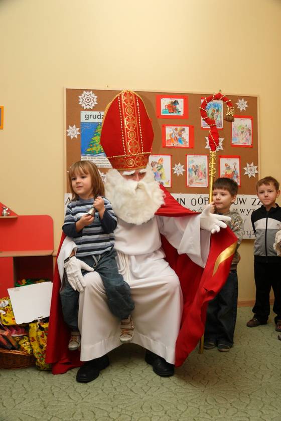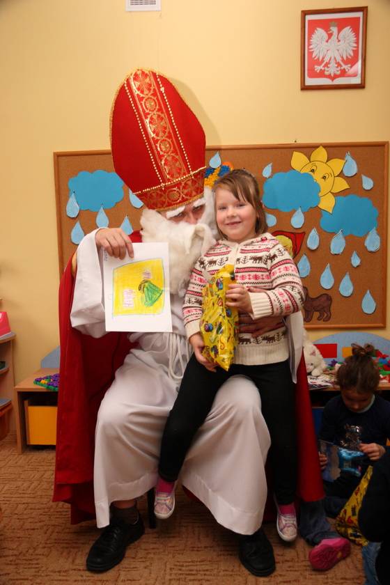 Dnia 6 grudnia 2012 roku w progi naszego przedszkola przybył długo oczekiwany Święty Mikołaj – w stroju biskupa, tak jak głosi legenda. Już od samego rana dzień ten zapowiadał się niezwykle – padał śnieg, a w przedszkolu wszystkie dzieci nasłuchiwały, czy nie słychać dźwięku dzwonka Świętego. Niezwykły gość pojawił się w zaśnieżonym ogródku i zapukał w okno. Dzieci powitały go piosenką, tańcem i specjalnie przygotowanymi na tę okazję wierszykami. W zamian za to Mikołaj obdarował wszystkich wspaniałymi prezentami i łakociami. Święty bardzo się ucieszył, że w tym roku również czekało na niego tak dużo dzieci. Rozmawiając z nimi, zachęcał, aby były grzeczne, słuchały rodziców oraz starszych, przestrzegł największych psotników. Wszystkie dzieci chętnie pozowały do pamiątkowego zdjęcia ze Św. Mikołajem. Spotkanie minęło w bardzo miłej atmosferze. Do zobaczenia za rok!