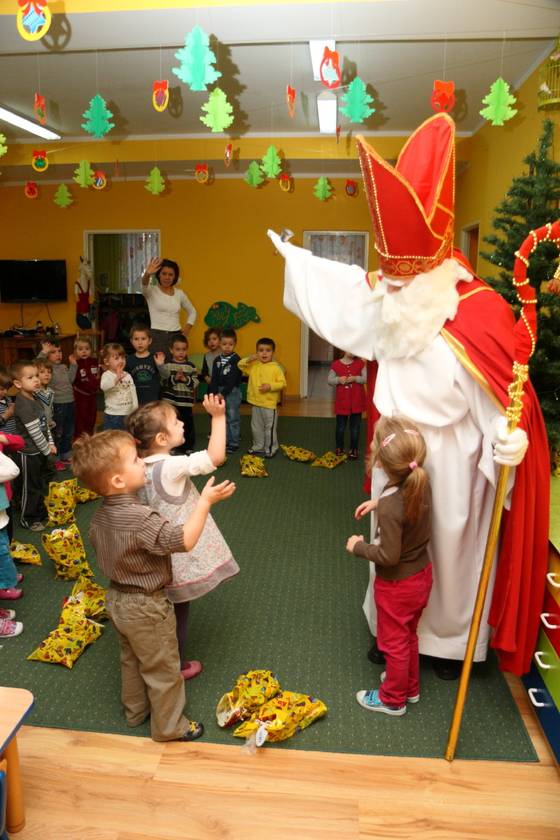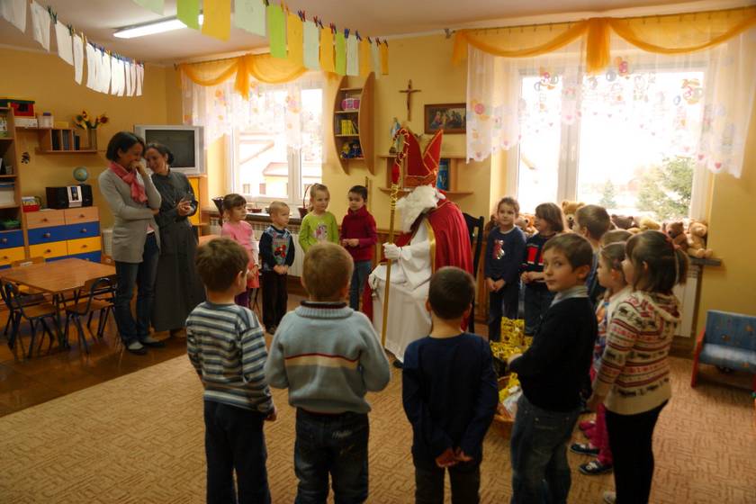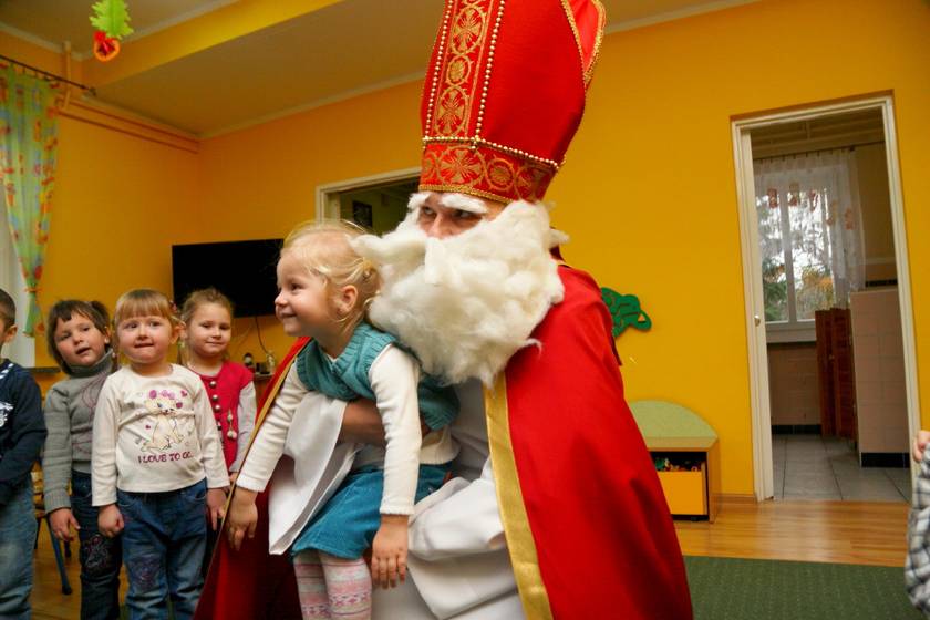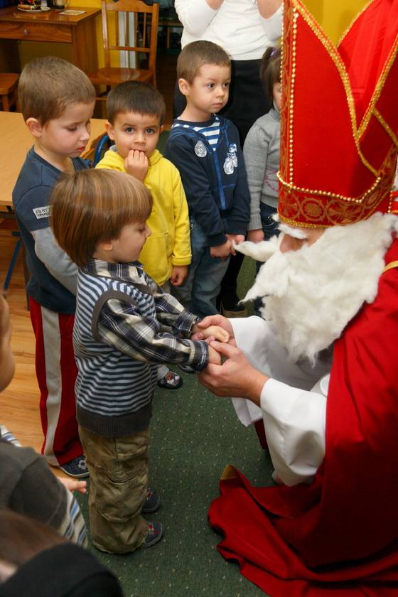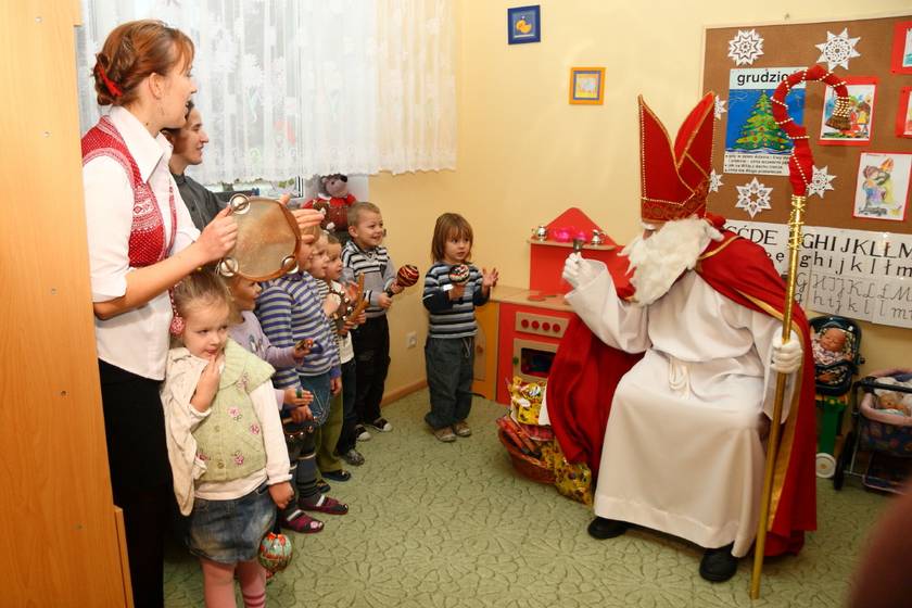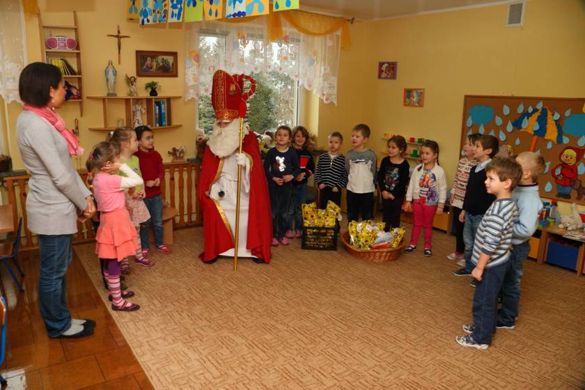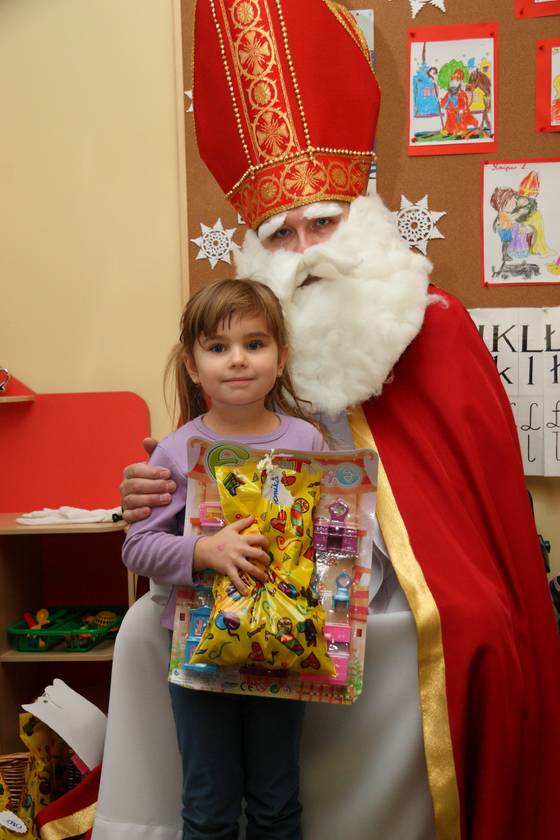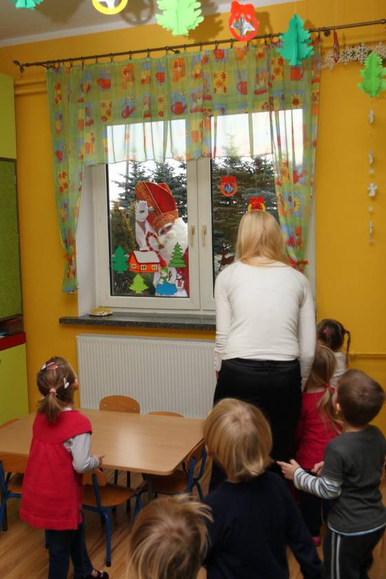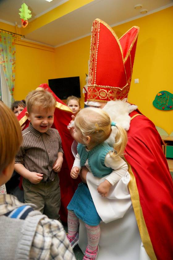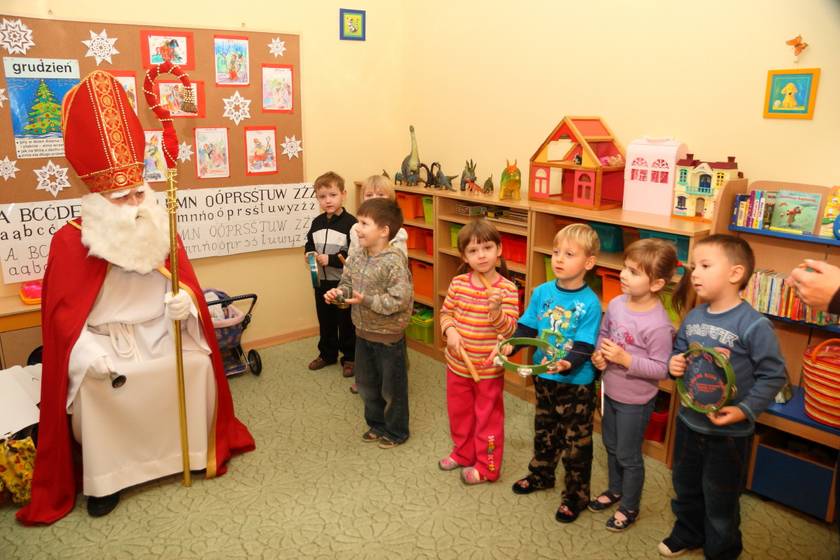 Dnia 6 grudnia 2012 roku w progi naszego przedszkola przybył długo oczekiwany Święty Mikołaj – w stroju biskupa, tak jak głosi legenda. Już od samego rana dzień ten zapowiadał się niezwykle – padał śnieg, a w przedszkolu wszystkie dzieci nasłuchiwały, czy nie słychać dźwięku dzwonka Świętego. Niezwykły gość pojawił się w zaśnieżonym ogródku i zapukał w okno. Dzieci powitały go piosenką, tańcem i specjalnie przygotowanymi na tę okazję wierszykami. W zamian za to Mikołaj obdarował wszystkich wspaniałymi prezentami i łakociami. Święty bardzo się ucieszył, że w tym roku również czekało na niego tak dużo dzieci. Rozmawiając z nimi, zachęcał, aby były grzeczne, słuchały rodziców oraz starszych, przestrzegł największych psotników. Wszystkie dzieci chętnie pozowały do pamiątkowego zdjęcia ze Św. Mikołajem. Spotkanie minęło w bardzo miłej atmosferze. Do zobaczenia za rok!