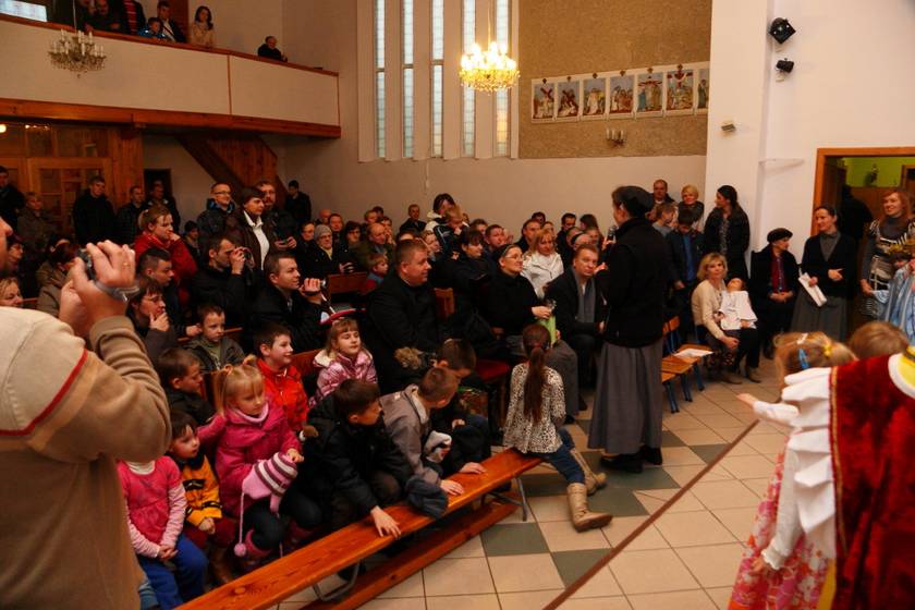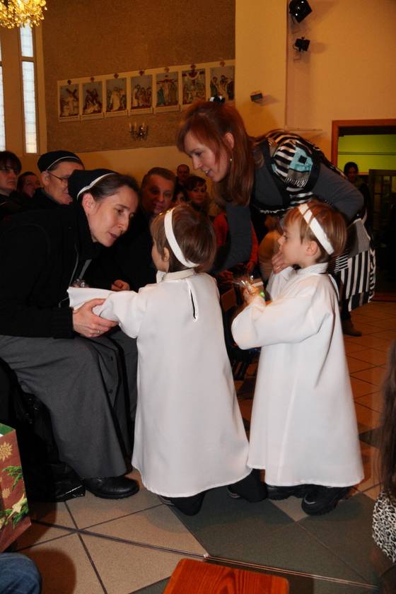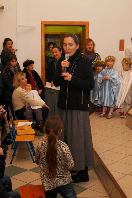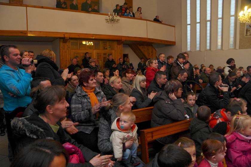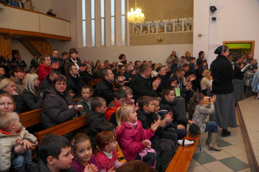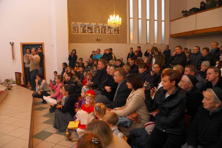 Spotkaliśmy się w piątek 14 grudnia i w niedzielę 16 grudnia 2012 r., w naszej kaplicy Sióstr Urszulanek w Sokolnikach Wielkich, aby podziwiać talenty naszych małych aktorów. Dzieci, jak i dorośli, byli zaskoczeni dużą frekwencją ze strony rodziców, babć i dziadków, zaproszonych gości. Jeden Aniołek z grupy maluchów stojąc na scenie zobaczył "tłum" ludzi, był bardzo zdziwiony tą sytuacją, gdyż dzieci ćwiczyły Jasełka w pustej kaplicy i widząc tak liczne grono gości powiedział: "A te wszystkie ludzie co tu robią". Wiedząc, że za chwilę będzie następne pytanie wyjaśniłam dziecku, że wszyscy przyszli posłuchać jak maluszki śpiewają Dzieciąteczku kolędy. Aniołek mógł dalej spokojnie występować.