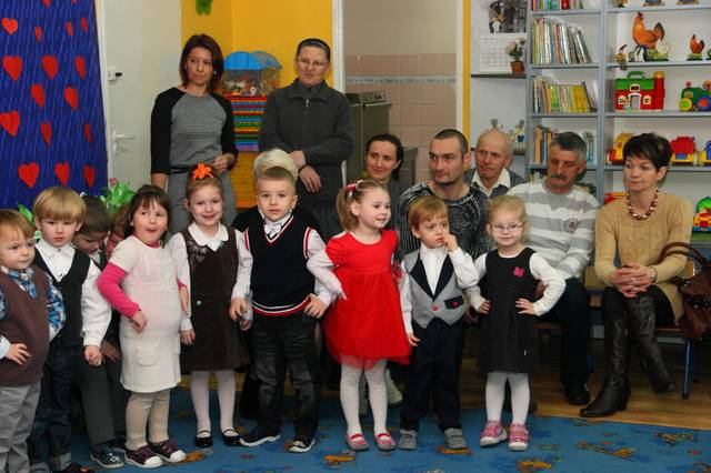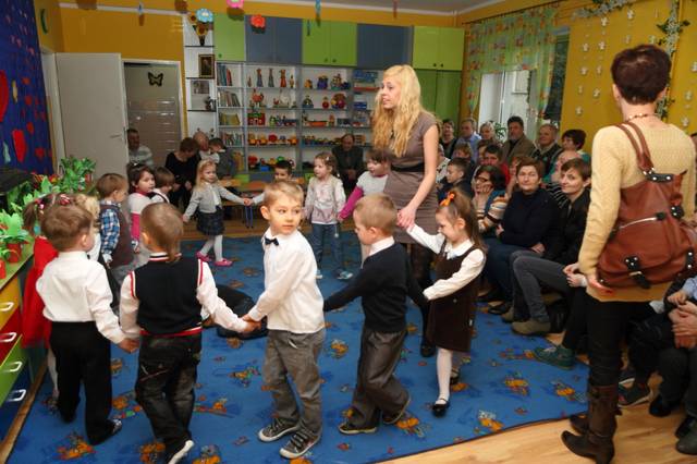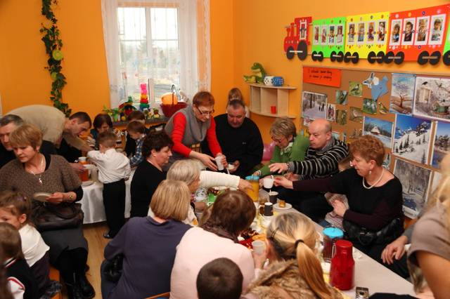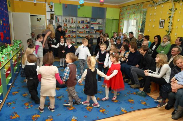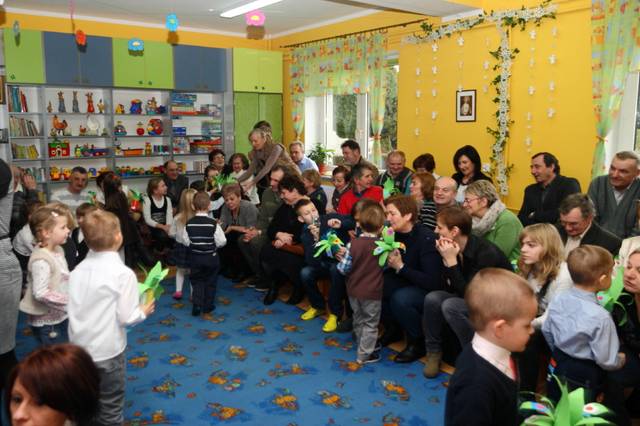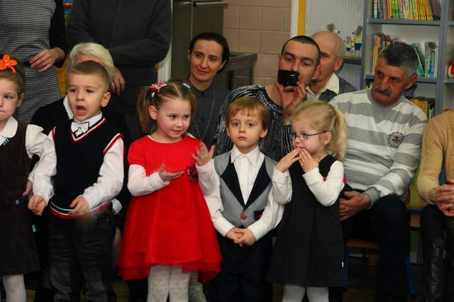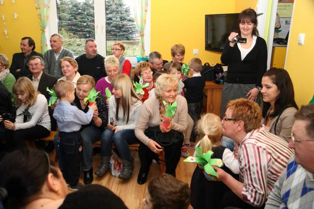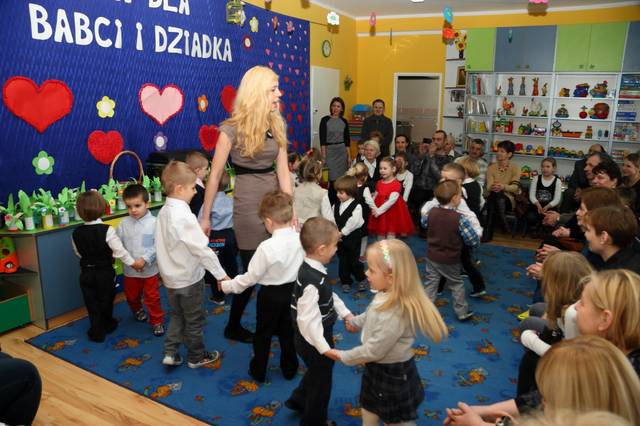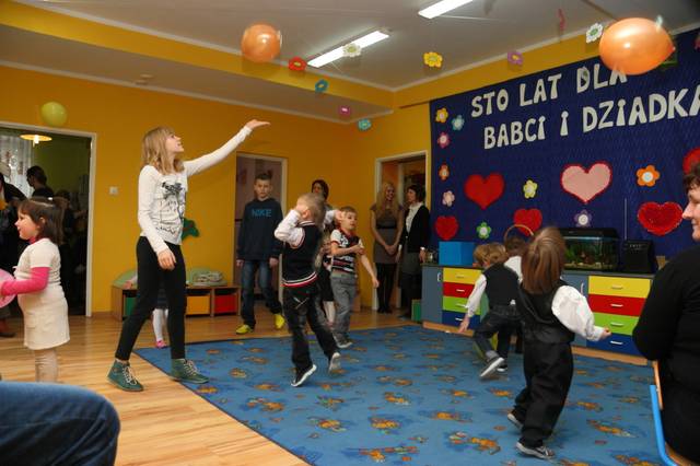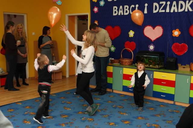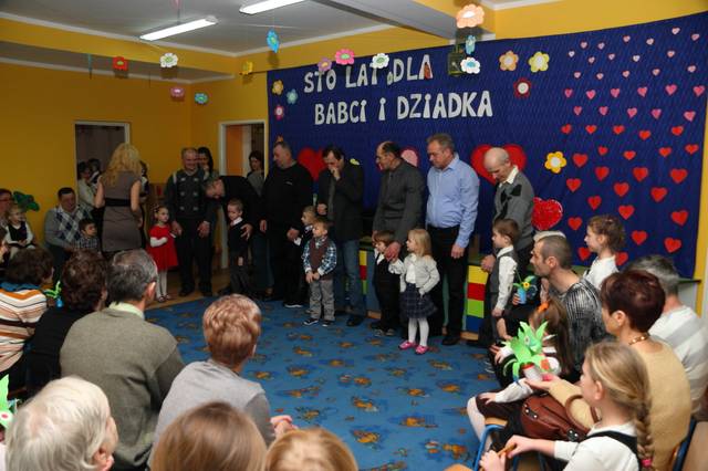 9 lutego 2013 r. do naszego przedszkola zawitali niezwykli goście. Byli to nasi dziadkowie. Maluszki wjechały ?pociągiem? do sali, gdzie siedzieli już uśmiechnięci goście. Na początek przywitaliśmy naszych dziadków piosenką "Całuski", która rozbawiła każdego. Następnie dzieci wraz z pomocą pani Asi przedstawiły wierszyk pod tytułem "Prezenty", ilustrując go przedmiotami, o jakich była mowa w wierszu. Na zakończenie części artystycznej dzieci zatańczyły i zaśpiewały piosenkę "Babciu, droga babciu". Wówczas nadszedł czas na podziękowania za miłość i okazywaną troskę swoim babciom i dziadkom wręczając im własnoręcznie zrobione kwiatki oraz laurki.