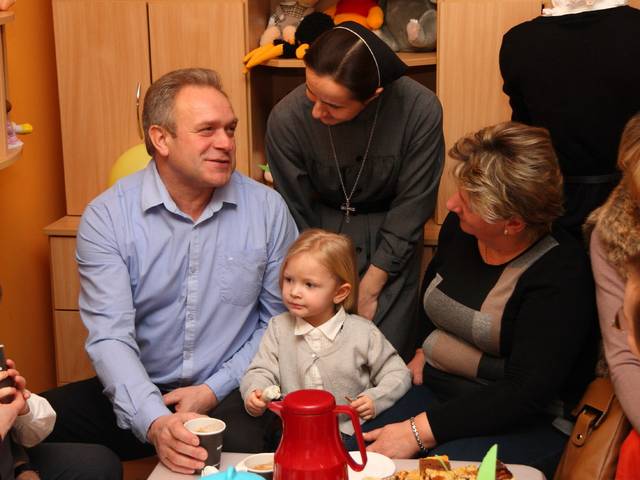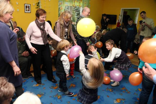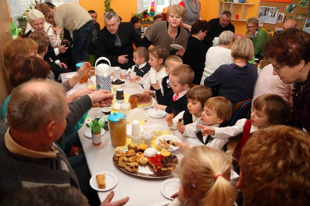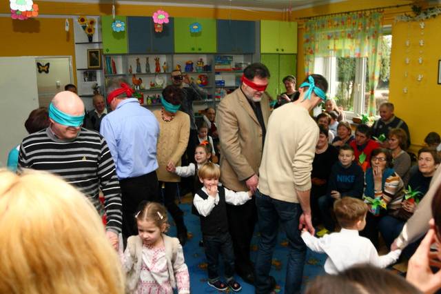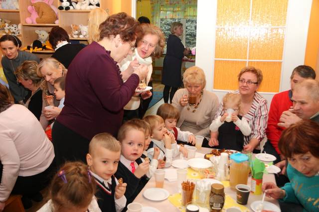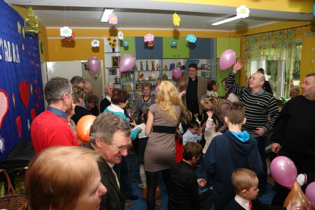 Drugą częścią spotkania były zabawy z babcią i dziadkiem. Do pierwszej zabawy zostały zaproszone babcie, które musiały wykazać się znajomością głosu swojego wnuka. Następnie do zabawy zaprosiliśmy kochanych dziadków, którzy tańczyli z wnukami oraz wnuczkami do piosenki, a następnie musieli odszukać i dotknąć się różnymi częściami ciała. Nie lada wyzywaniem była zabawa pt. prowadzenie niewidomego, w której dziadek, mając na oczach chustę, był prowadzony przez swojemu wnuka. Gratulujemy odwagi! Na zakończenie zabaw odbył się bal baloników. Po tych niesamowitych emocjach zaprosiliśmy naszych gości na słodki poczęstunek.