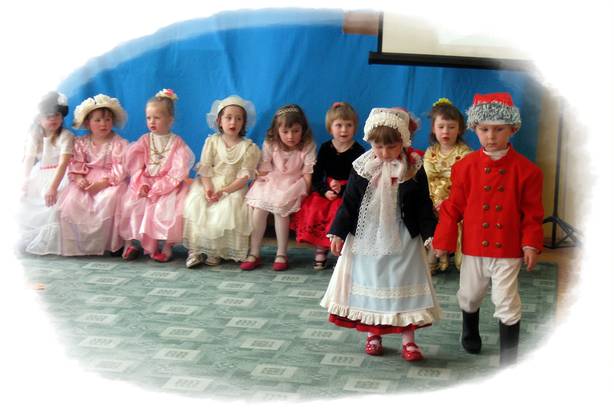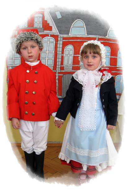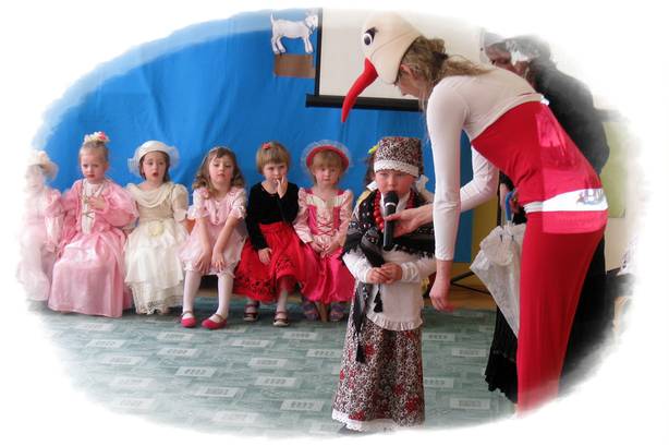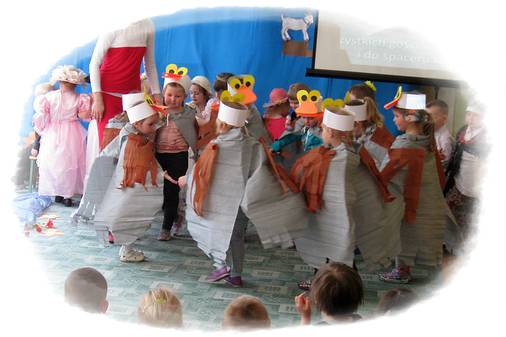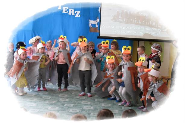 W kolejnej części programu artystycznego mali aktorzy wcielili się w niezwykłe postaci. Na scenie pojawił się listonosz, ksiądz, hrabina i jej świta z kaźmierskiego pałacu, przekupka, kaczki z Zalewu Radzyńskiego oraz mali Kaźmierzanie ubrani w tradycyjne stroje. Przedszkolaki rozwiązywały zagadki i świetnie się przy tym bawiły. Nie zabrakło również zagadek dla wychowawców, a nie były one łatwe. Dzieci dowiedziały się, że nasz Kaźmierz był kiedyś miastem, a Panie odgadły kim była jego właścicielka oraz jaki lokal znajdował się dawnej w kamienicy kaźmierskiego rynku. Pierwsza przygoda za nami – teraz czekamy na popisy naszych kolegów i koleżanek z pozostałych oddziałów przedszkolnych. Już w niedługo odkryjemy interesujące miejsca w Wielkopolsce, dowiemy się co ciekawego można zobaczyć w Toruniu, Warszawie i Krakowie. Bądźcie z nami! Dziękujemy rodzicom dzieci 3-letnich za pomoc w przygotowaniu strojów dla dzieci.