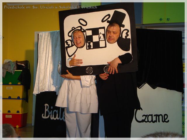 Bohaterowie: poeta Pan Czarny i malarka Pani Biała wprowadzili nas w świat malowany i pisany czarno-białymi odwołaniami do zjawisk otaczającego nas świata. Aktorzy, nawiązując żywy kontakt z uczestnikami przedstawienia, zaskarbili sobie ich sympatię i uznanie - dzieci z ogromnymi emocjami wypisanymi na twarzy brały udział w spektaklu. Mamy nadzieję, że Pan Orzełek i jego „świta” wkrótce zawitają ponownie w progi naszego przedszkola!