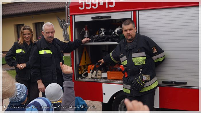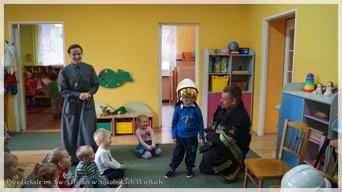 W drugim tygodniu października w Przedszkolu Niepublicznym im. św. Urszuli Ledóchowskiej w Sokolnikach Wielkich miało miejsce ciekawe spotkanie. Dzieci odwiedzili strażacy z jednostki OSP z Kaźmierza. Przedszkolaki mogły posłuchać o ich pracy, zadać pożarnikom nurtujące ich pytania, obejrzeć wóz strażacki, zapoznać się ze sprzętem ratowniczo-gaśniczym, a nawet przymierzyć hełm strażacki.