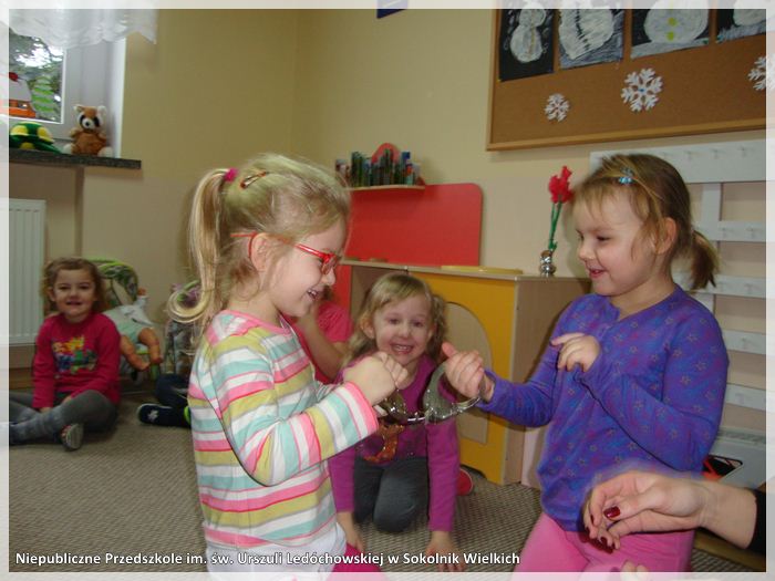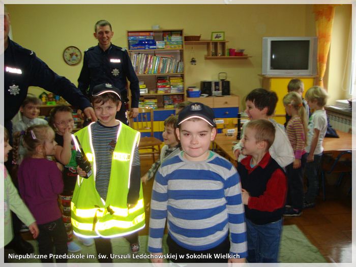21 stycznia 2015 r., dzieci z Niepublicznego Przedszkola im. św. Urszuli Ledóchowskiej z Sokolnik Wielkich miały możliwość uczestniczenia w ciekawym spotkaniu z policjantami z Kaźmierza. Goście poprowadzili z przedszkolakami rozmowę kierowaną o bezpieczeństwie w ruchu drogowym oraz przestrzegli przed tym, by nie obdarzać zaufaniem obcych im ludzi. Panowie zapoznali dzieci również z policyjnym ekwipunkiem.