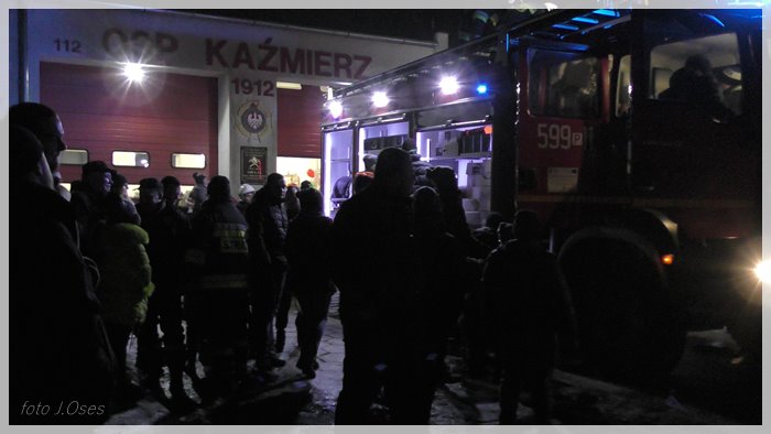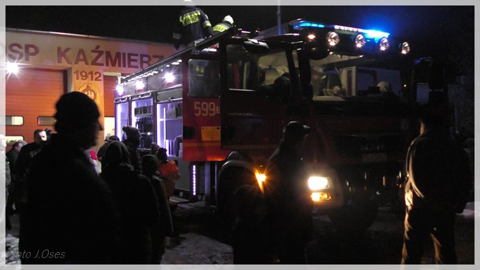 Druhowie strażacy po auto pojechali już w czwartek aż do Kielc. W piątek pozostali strażacy z niecierpliwością oczekiwali na przyjazd kolegów. Kilka minut po godz. 19.00 auto dotarło do Kaźmierza. Na ul. Poznańskiej czekały już na nie pozostałe auta z jednostki OSP, które towarzyszyły nowemu pojazdowi w drodze do remizy. Po drodze kolumna wozów strażackich zatrzymała się przy miejscowym cmentarzu, a druhowie strażacy udali się do grobu zmarłego w roku 2015 prezesa kaźmierskiej OSP śp. Andrzeja Nowackiego w celu złożenia zapalonych zniczy. Ten symboliczny gest miał na celu oddanie hołdu byłemu prezesowi, który kilka lat temu zapoczątkował starania o zakup nowego auta dla kaźmierskiej jednostki. Następnie kolumna aut ruszyła pod remizę, przejeżdżając przez szpaler utworzony przez strażaków z racami. Nie zabrakło także fajerwerków. Na miejscu przed remizą na nowe auto czekali również; Przewodnicząca Rady Gminy Kaźmierz, Arleta Wojciechowska i wójt gminy Kaźmierz, Zenon Gałka. Przed remizą zebrała się spora grupa mieszkańców Kaźmierza, którzy z bliska chcieli obejrzeć nowy sprzęt kaźmierskich strażaków. Piękne auto będzie służyć strażakom z pewnością przez wiele lat, a o tym jak wielkim szacunkiem kolegów cieszył się dh Andrzej Nowacki, świadczy fakt, że pojazd (ochrzczono) imieniem JĘDRUCH (w taki sposób zwracano się do śp. Andrzeja) a tabliczkę z nazwą umieszczono za przednią szybą.