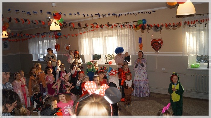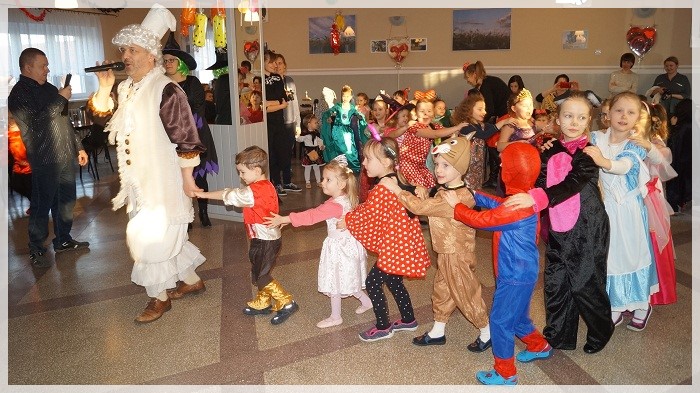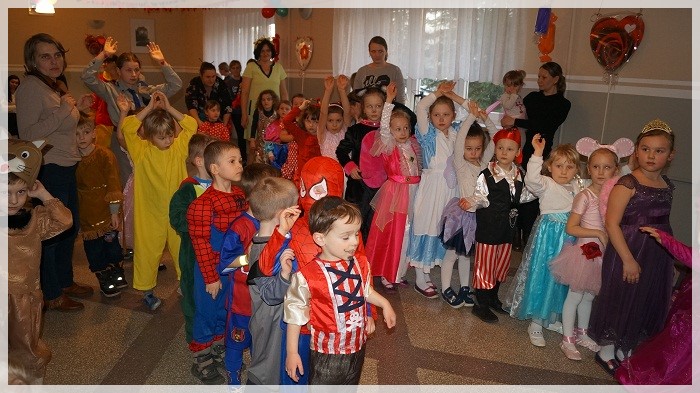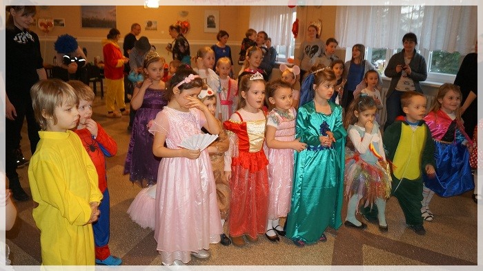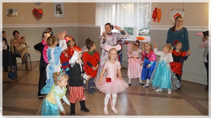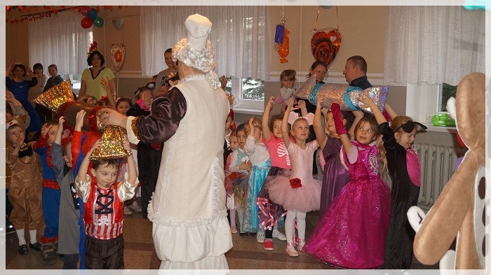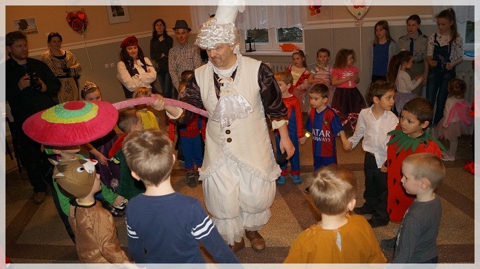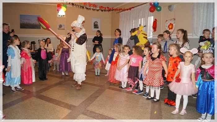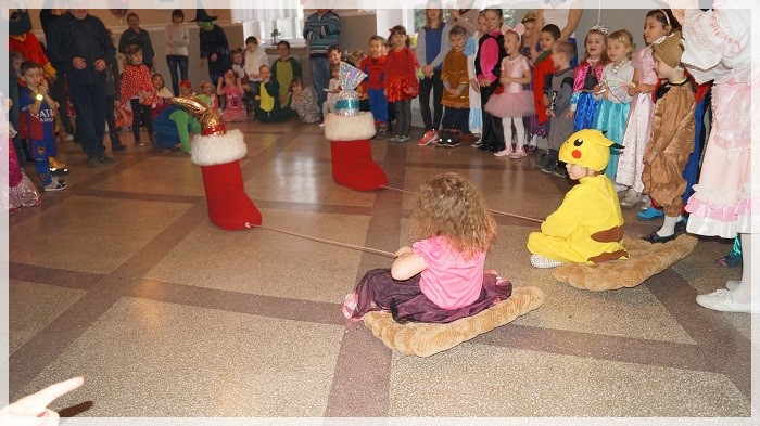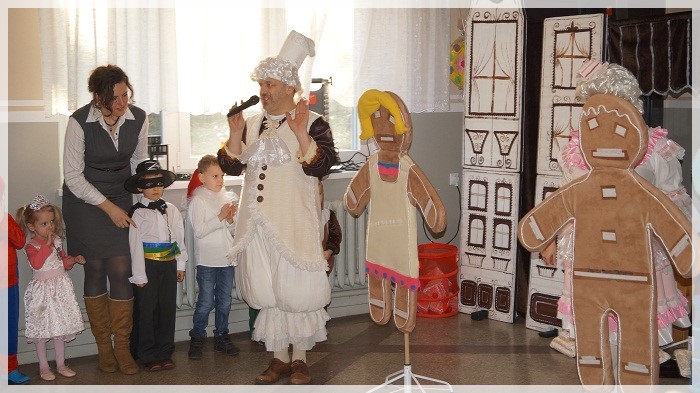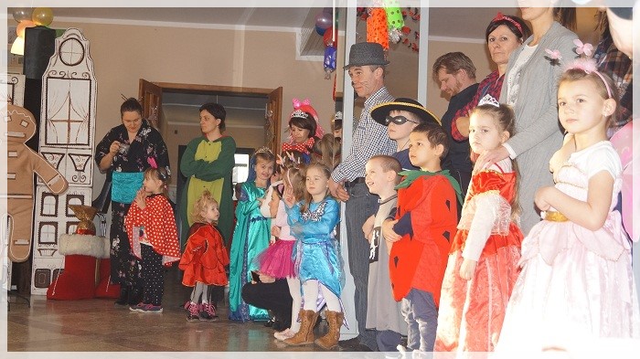 Najwięcej emocji wywołały wyścigi w przekazywaniu łakoci w dwóch rzędach- dziewczynek i chłopców oraz „karmienie” Jasia i Małgosi kawałkami tortu. We wszystkich zabawach Pan Marcepan ogłaszał remis, ponieważ ważna była dziecięca radość i integracja społeczności przedszkolnej, a nie zwycięstwo! Dziękujemy wszystkim rodzicom za zaangażowanie w przygotowanie pięknych strojów karnawałowych oraz personelowi przedszkola za poświęcony czas i udział w całości przygotowań. Szczególne podziękowania kierujemy pod adresem Pani Sołtys Katarzyny Lachowicz za udostępnienie pięknie udekorowanej sali.