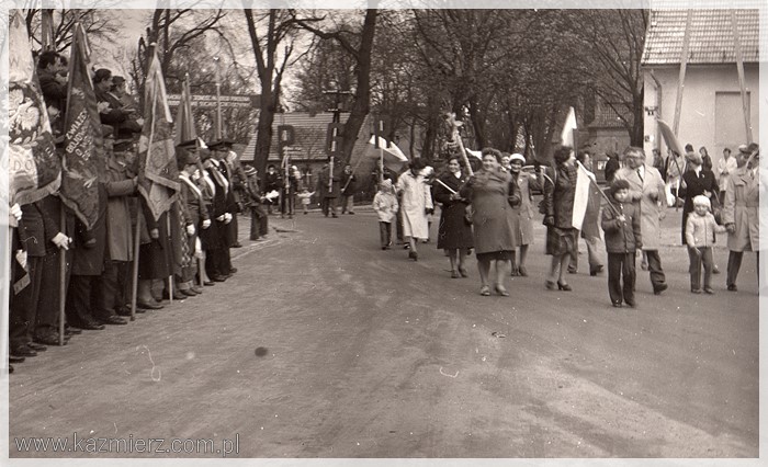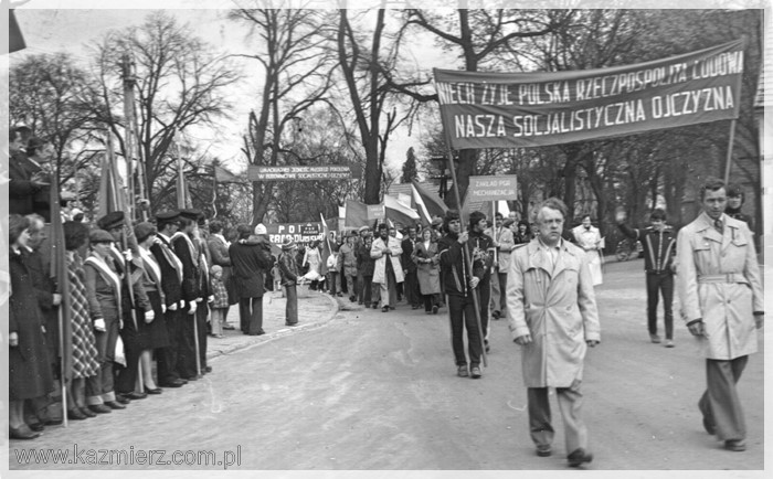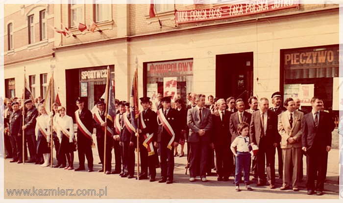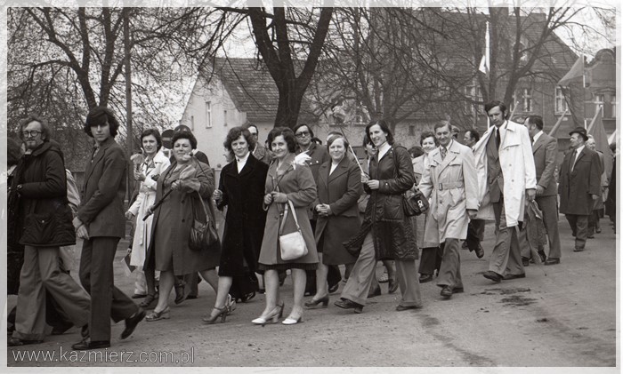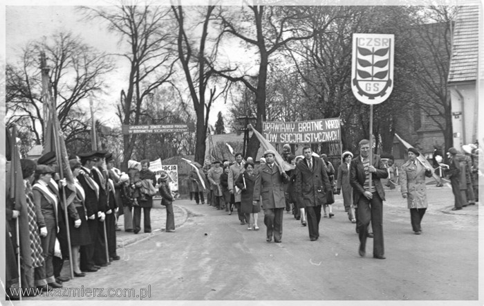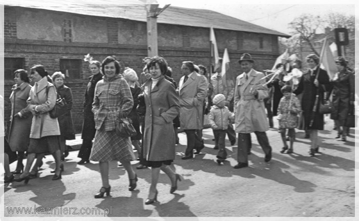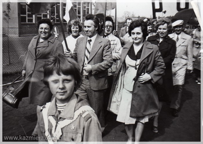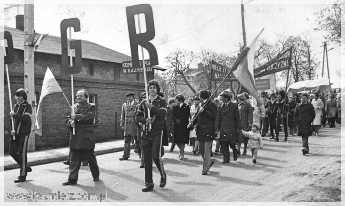 No, długich weekendów raczej nie było. Wszystko ograniczało się do dnia 1-szego maja, w którym obchodzimy Święto Pracy. Pamięć o 3 maja próbowano w ogóle zatrzeć. Natomiast obchody Święta Pracy były bardzo huczne. Przed świętem zazwyczaj organizowane były tzw. czyny społeczne, w których uczestniczyli (często pod przymusem) pracownicy urzędów i zakładów pracy nierzadko wspomagani przez naczelników i dyrektorów. Czyny polegały na sprzątaniu, malowaniu wapnem krawężników (jeżeli takowe były), sadzeniu kwiatków w centralnych miejscach wsi, miast i miasteczek. W dniu 1 maja organizowano pochody (dla pracowników i uczniów szkół obowiązkowe), podczas których niesiono flagi państwowe i transparenty z kiepskimi hasłami. Pochody przechodziły przed trybuną honorową na której stali zazwyczaj lokalni przedstawiciele „władzy ludowej” i wyżsi rangą członkowie PZPR. Podobnie było i u nas. Pochód rozpoczynał się zbiórką przy bramie Kombinatu PGR, przechodził przez rynek i kończył się raz na boisku szkolnym innym razem przy Urzędzie Gminy lub na tzw. „Błutku”, czyli boisku sportowym leżącym obecnie przy ul. Gimnazjalnej. Były także festyny, występy dzieci i młodzieży szkolnej oraz darmowa bułka z kiełbaską. Dzisiaj niektórzy z nostalgią wspominają tamte czasy, ale większość miała już dość tej udawanej maskarady, która zakłamywała ówczesny stan polskiej gospodarki. Szkoda tylko tych zakładów pracy, które bezpowrotnie zniknęły z mapy naszej gminy. Poniżej kilka fotografii przedstawiających czyn społeczny pracowników Urzędu Gminy i pochody pierwszomajowe w Kaźmierzu.