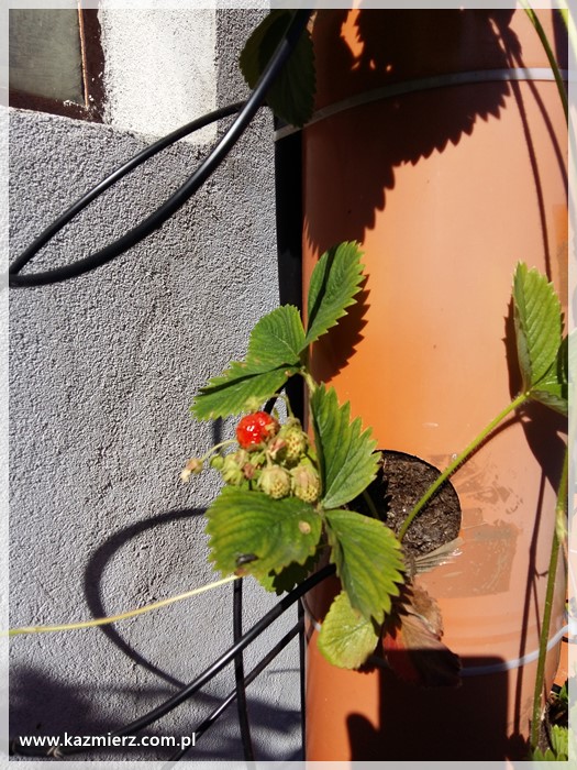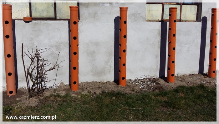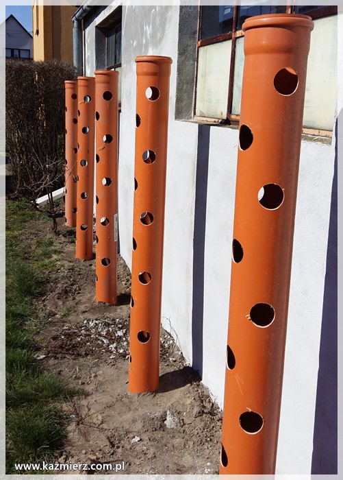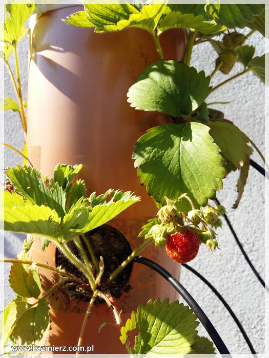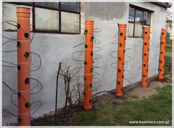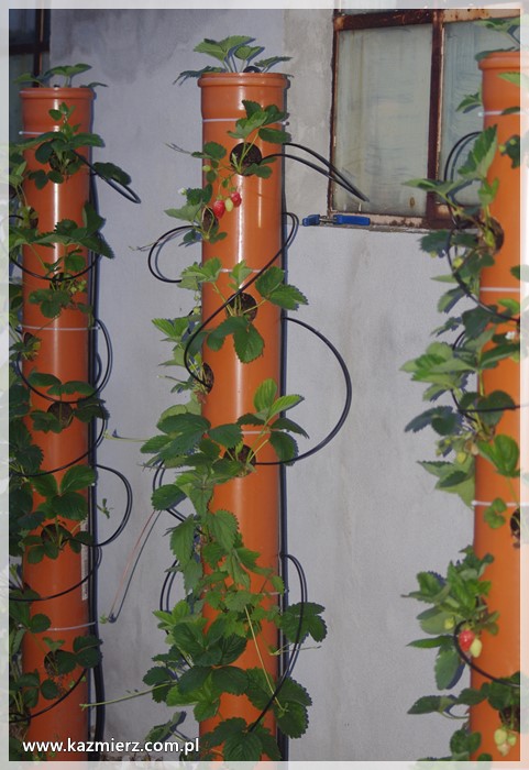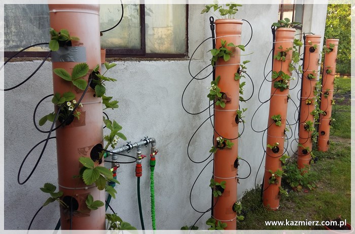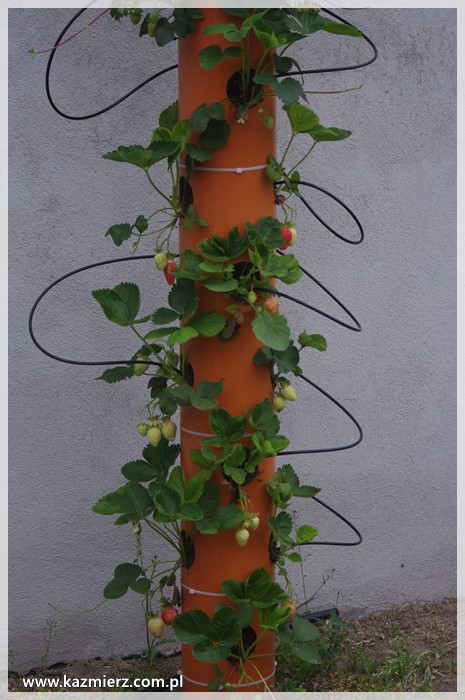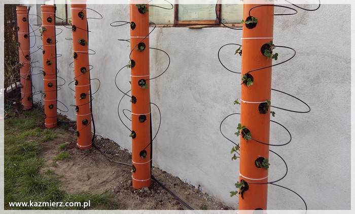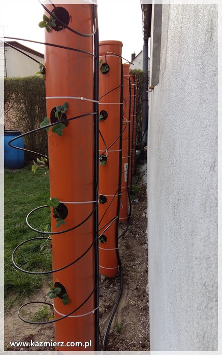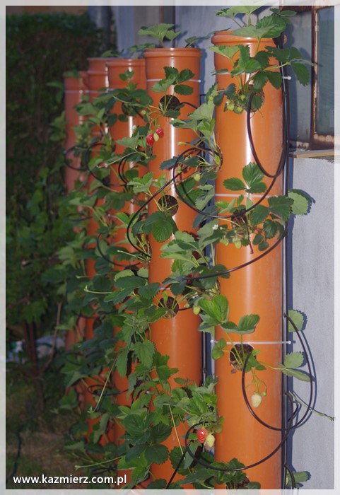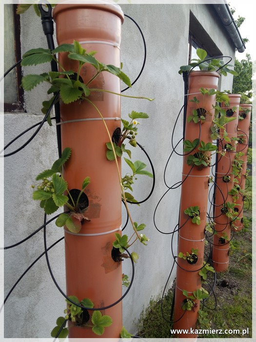 Dzisiaj temat dla ludzi, którzy mają ograniczony metraż w przydomowych ogródkach. Chciałbym zaproponować Wam uprawę truskawek w rurach. W moim ogródku rury stoją już trzeci sezon. W tym roku krzewy nieco przymarzły i szału z plonami nie ma, ale w ubiegłym roku było całkiem nieźle. Do stworzenia plantacji potrzebujemy dwumetrowe rury kanalizacyjne o średnicy minimum 160 mm, w których wiercimy otwory o średnicy około 6 cm. U mnie w 5 rurach mam po 15 otworów co daje 75 krzaczków. Rury wkopujemy w ziemię na około 50 cm, następnie otwory zaklejamy taśmą, a rurę napełniamy ziemią. Ważne jest, aby ziemię maksymalnie dobrze ubić, ponieważ kiedy wsadzimy w otwory sadzonki truskawek i zaczniemy je podlewać, pod ciężarem wody ziemia zacznie osiadać, a krzaczki poznikają nam w otworach. Wiem, co mówię, bo sam to przerabiałem ;)