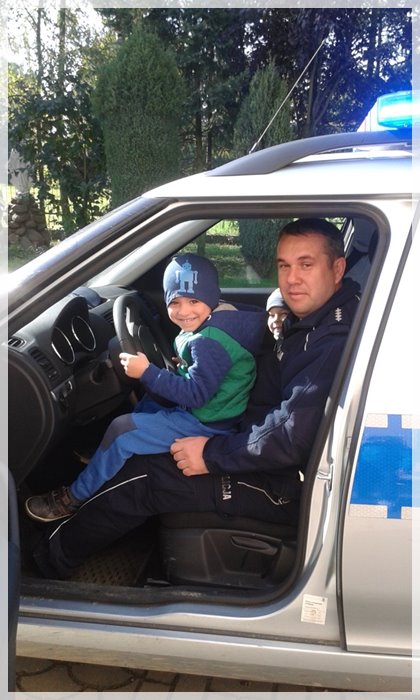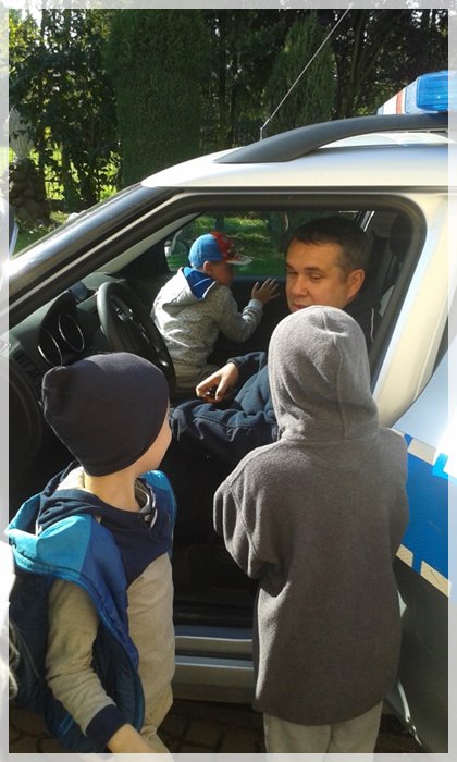 Gość zwrócił także uwagę na niebezpieczeństwa, jakie mogą czyhać na dzieci w kontaktach z obcymi ludźmi i omówił sposoby unikania ich. Duże zainteresowanie u dzieci wywołało umundurowanie i wyposażenie policjanta. Uwieńczeniem spotkania była możliwość obejrzenia z bliska radiowozu. Każde dziecko miało okazję usiąść na chwilę za kierownicą, lub w tylnej części radiowozu. Mamy nadzieję, że dzięki takim spotkaniom policjant będzie kojarzył się dzieciom, jako osoba, której nie należy się bać i do której zawsze i w każdej sytuacji można zwrócić się o pomoc.