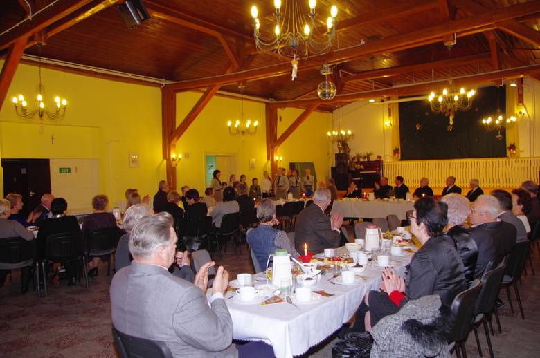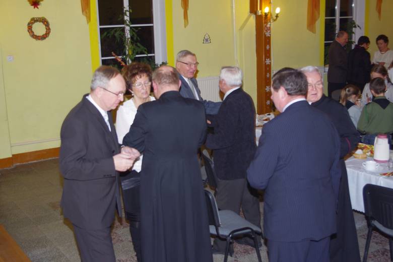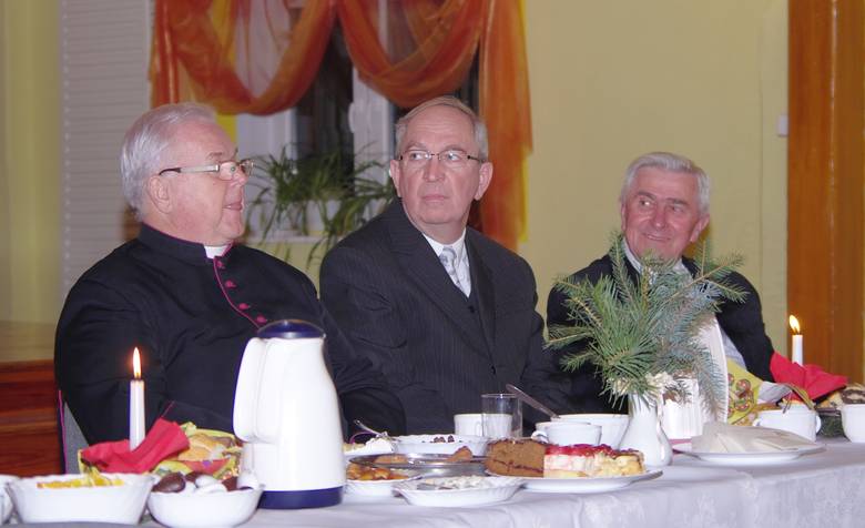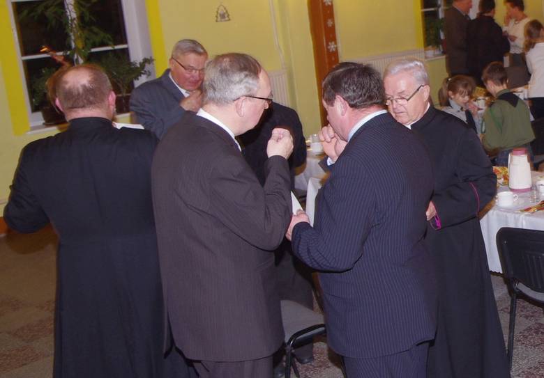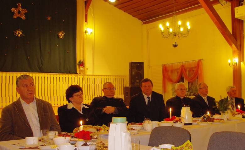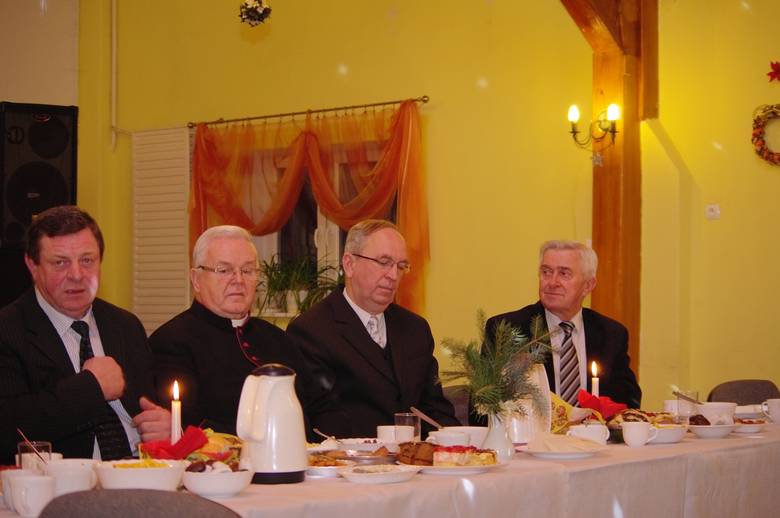 Po wysłuchaniu relacji z przebiegu wyprawy na Kresy głos zabrali obecni na sali kapłani oraz członek naszego towarzystwa p. Wiesław Włodarczak, który zauważył, że wigilie TMWiZW od lat przypominają prawdziwie rodzinne spotkania. Ksiądz kanonik Zdzisław Potrawiak podziękował za pamięć i zaproszenie, a warto tutaj wspomnieć, że z TMWiZW odział Kaźmierz związany jest od początku jego powstania, czyli od roku 2002. Ks. proboszcz Krzysztof Musiał przeczytał fragment ewangelii, złożył wszystkim najserdeczniejsze życzenia z okazji Świąt Bożego Narodzenia, po czym zaintonował kolędę „Wśród nocnej ciszy”. W dalszej części połamano się tradycyjnym opłatkiem składając sobie nawzajem życzenia wszystkiego najlepszego w nadchodzącym Nowym Roku 2013.