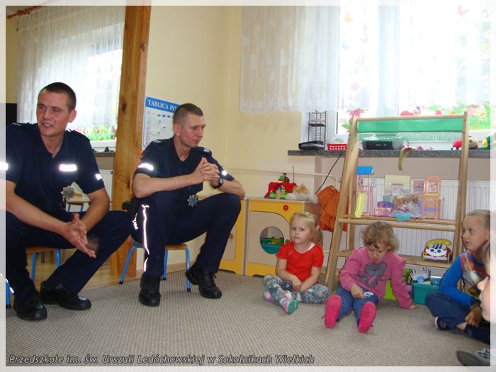 18 czerwca Przedszkole Niepubliczne im. św. Urszuli Ledóchowskiej w Sokolnikach Wielkich odwiedzili policjanci z Kaźmierza. Dzieci poznały panów już podczas wcześniejszych odwiedzin, dlatego nie miały trudności z zadawaniem im pytań, czy ze swobodną konwersacją. Policjanci chętnie włączyli się w rozmowy przedszkolakami, byli otwarci na ich pytania i pomysły. Spotkanie z policjantami okazało się świetną okazją do poprowadzenia rozmowy o niebezpieczeństwach wynikających z wakacyjnych pobytów nad wodą czy na wsi, oraz o tym, jak się przed nimi można ustrzec.