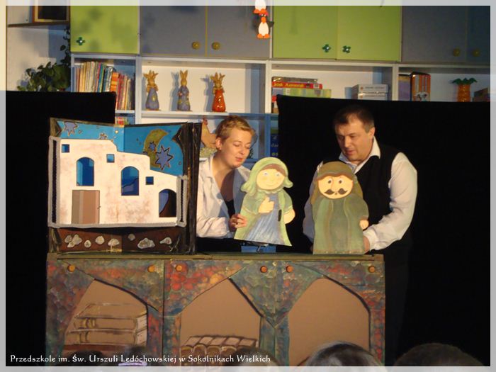 Znany dobrze dzieciom z przedszkola im. św. Urszuli Ledóchowskiej z Sokolnik Wielkich Teatrzyk Pod Orzełkiem, po raz kolejny zaskoczył ich swoją wizytą. Tym razem przedstawienie mieściło się w klimacie świąteczno-bajkowych tradycji nie-tradycji. Postacie z bajek (m.in. Wilk czy Baba Jaga), które dotychczas uważane były za złe, zmieniają swój „wizerunek” i postanawiają pomóc małemu Jezuskowi. Ten nagły „przewrót” prowadzi do serii ciekawych zdarzeń. Pan Orzełek zauroczył zarówno młodszych, jak i starszych widzów humorem, nietypową interpretacją, zakorzenieniem w historii, ale i wyjściem poza nią. Z niecierpliwością oczekujemy następnego spotkania!