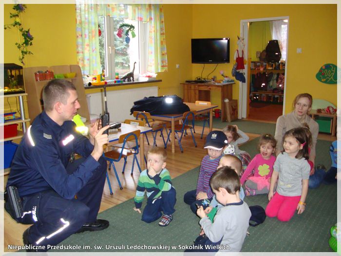 21 stycznia 2015 r., dzieci z Niepublicznego Przedszkola im. św. Urszuli Ledóchowskiej z Sokolnik Wielkich miały możliwość uczestniczenia w ciekawym spotkaniu z policjantami z Kaźmierza. Goście poprowadzili z przedszkolakami rozmowę kierowaną o bezpieczeństwie w ruchu drogowym oraz przestrzegli przed tym, by nie obdarzać zaufaniem obcych im ludzi. Panowie zapoznali dzieci również z policyjnym ekwipunkiem.