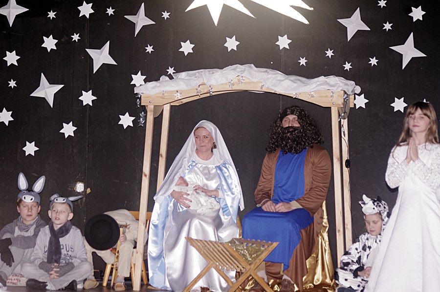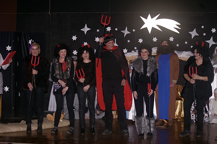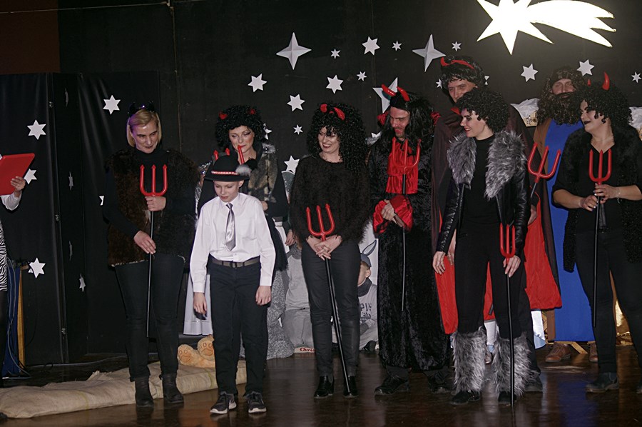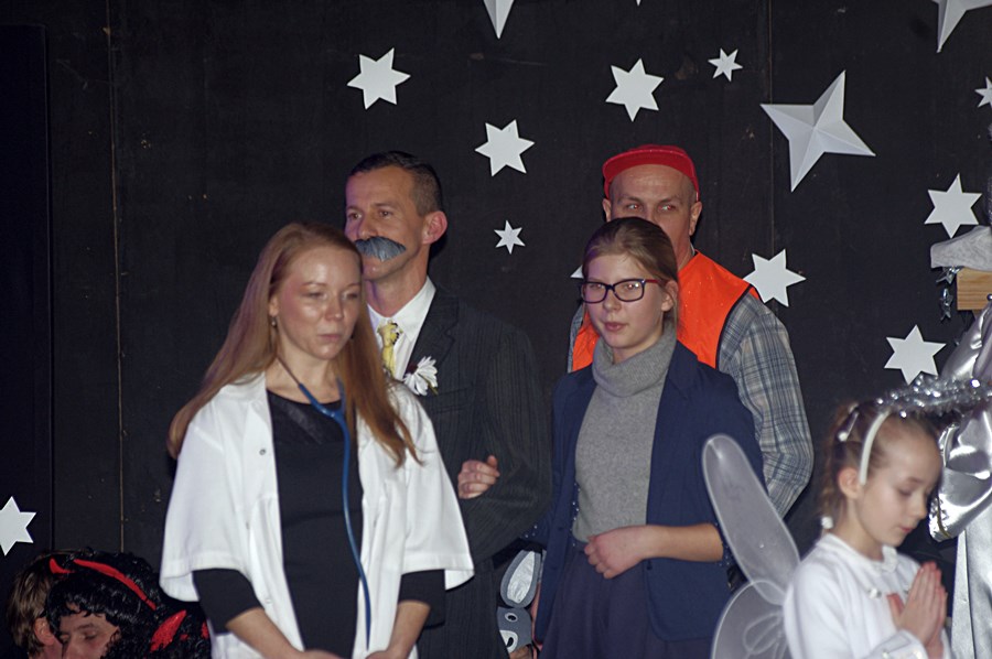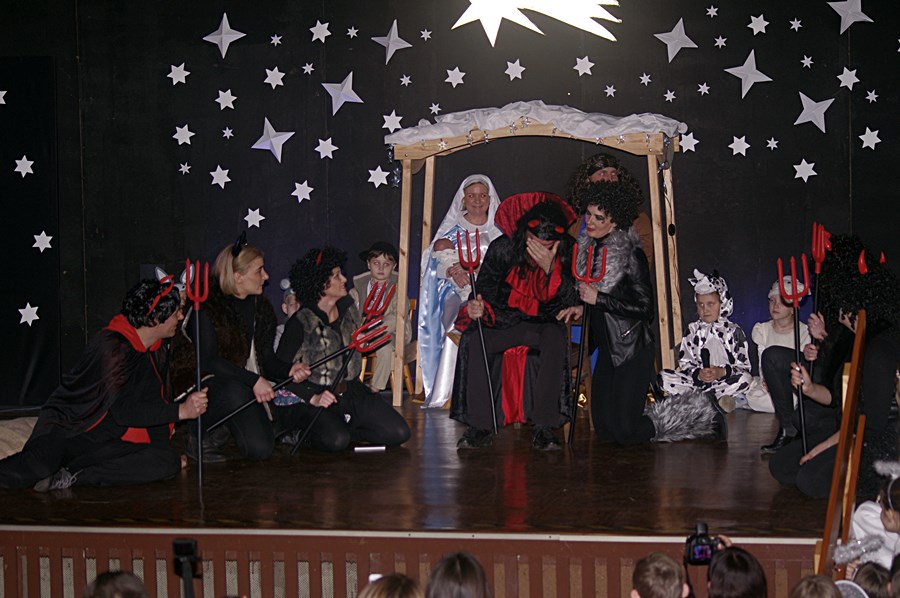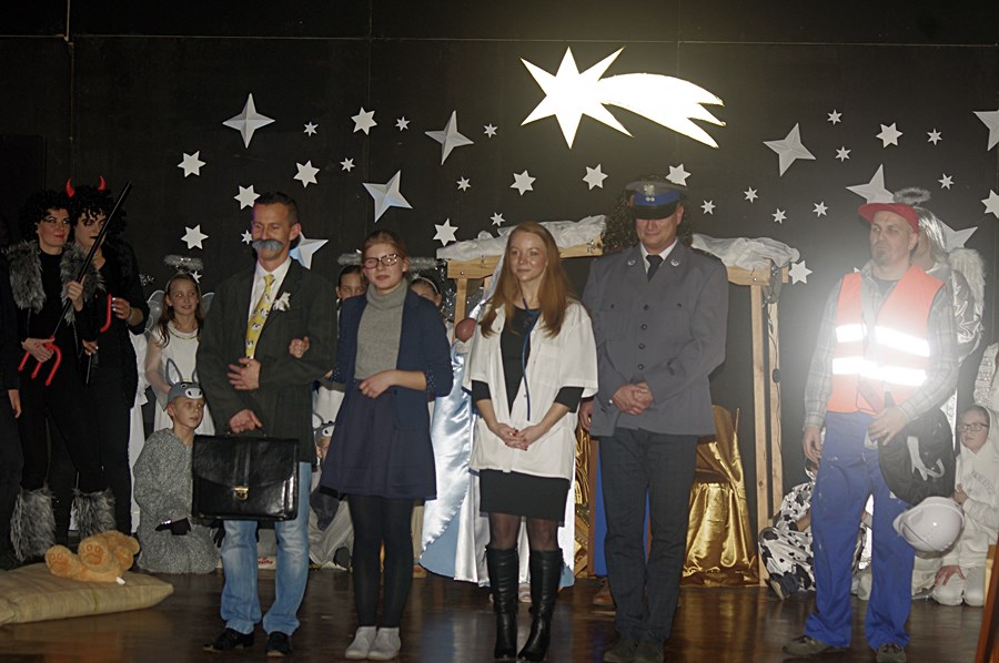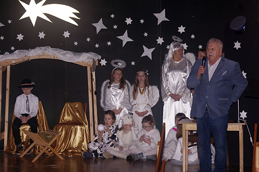 W środowy wieczór 9 stycznia 2019 r. uczniowie Szkoły Podstawowej im. Marii Dąbrowskiej w Kaźmierzu zaprosili lokalną społeczność na bożonarodzeniowe jasełka. Przedstawienie odbyło się w sali kinowej, która tego wieczoru zapełniła się całkowicie do tego stopnia, że nie dla wszystkich starczyło miejsc siedzących. W pierwszej odsłonie publiczność rozbawili uczniowie kl. IIIb, którzy na scenie wystąpili wraz ze swoimi rodzicami. Rozbawili, bo przedstawili sceny z Bożego Narodzenia w sposób humorystyczny. Były postacie biblijne, ale były także akcenty współczesne, chociażby postać wójta, który składa pokłon dzieciątku Jezus.