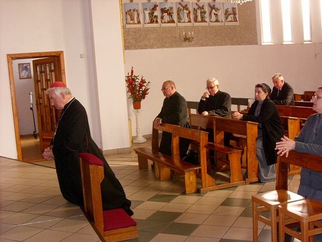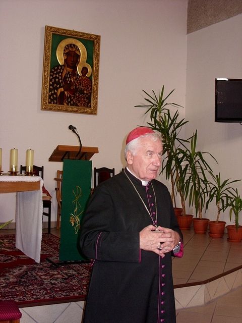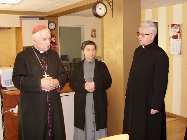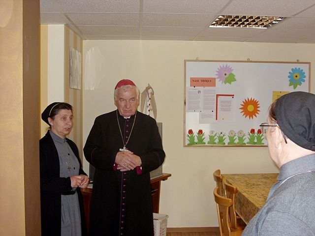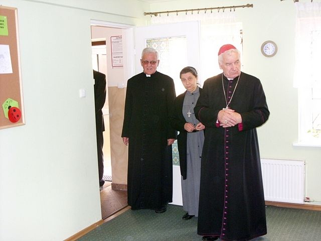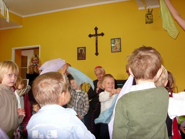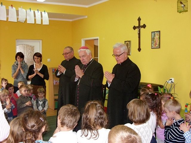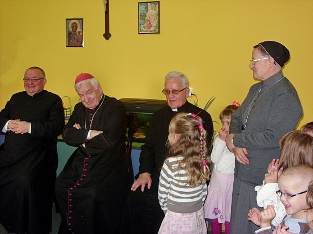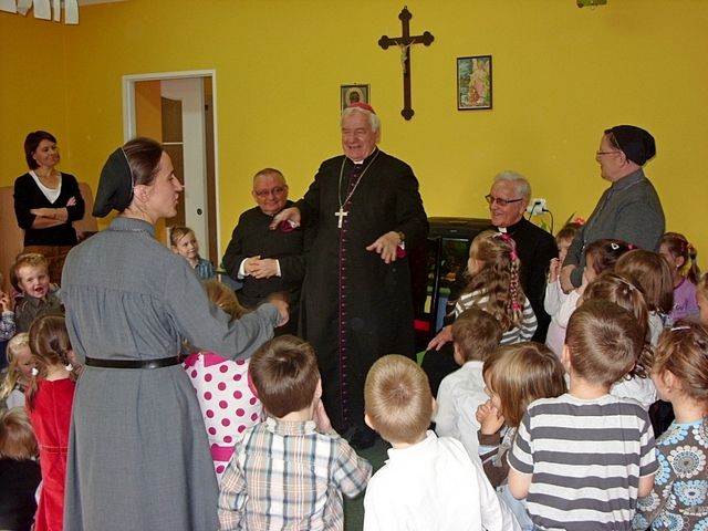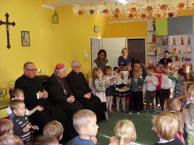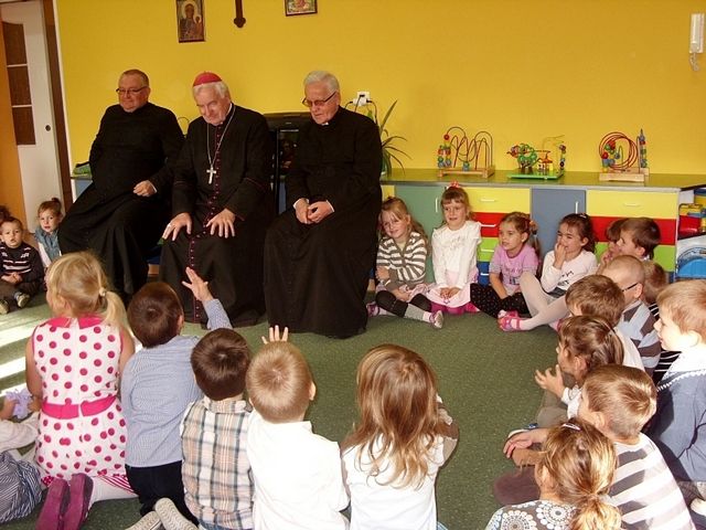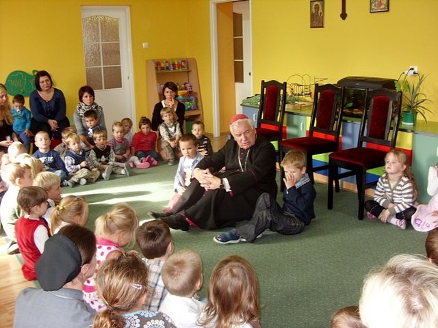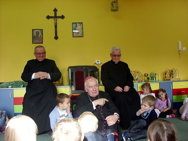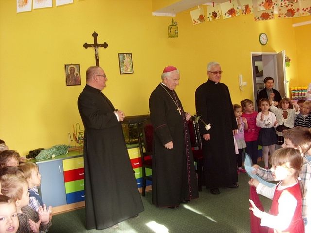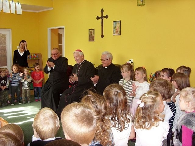 Z kolei dyrektor przedszkola s. Barbara Milewska wraz z wszystkimi przedszkolakami oraz personelem powitała gości w przedszkolnej sali. Kolejnym punktem spotkania były dziecięce występy. Już od samych drzwi milusińscy przywitali J.E. gromkim »Bądź Pozdrowiony Gościu nasz« a następnie zaśpiewały pioseneczkę pt. „paluszek”. W tym drugim przypadku sala zaniosła się wielkim śmiechem, kiedy gość przedstawił swoją nieco ironiczną wersję tej samej piosenki. Dzięki temu ksiądz Biskup nawiązał znakomity kontakt z dziećmi a one z wielką radością w dalszym ciągu prezentowały swoje umiejętności. Jeszcze delegacje przedszkolaków podarowały na pamiątkę wizyty prezenty. Okazało się, że wykonane własnymi rękom Aniołki i Laurki bardzo się również spodobały przybyszowi tak jak śpiew i taniec. Atmosfera jeszcze bardziej się rozluźniła, gdy gość usiadł na dywanie pośród „średniaków”, „starsaków” i maluszków. Fakt ten wprawił w zachwyt dzieci – niby dostojny ksiądz a potrafi z nami rozmawiać - zdało się wyczytać z dziecięcych twarzy. Po chwili zrobiło się cicho, ponieważ Biskup snuł opowieść o płaczącej dziewczynce i Wielkim Sercu. Po zakończeniu dzieci ochoczo z Nim rozmawiały i dyskutowały. Z rozmowy wyniknęła myśl, że: tylko Jezus może zaspokoić głód ludzkiego serca. Jego Miłość nigdy nie ustaje. Trzeba wierzyć w Miłość - czy to jest się małym, czy dorosłym człowiekiem. Na koniec gość jeszcze zdradził, że bardzo mu się spodobało w tym przedszkolu i że chciałby tu pozostać, ponieważ ......... mógłby sobie leżakować jednakże dalsza praca sprawia, że musi wszystkich pożegnać. Jeszcze wspólna modlitwa i biskupie błogosławieństwo i przyszedł czas rozstania. I miło zrobiło się przedszkolakom na sercach, kiedy usłyszały, że są „na medal” i że informację tę mają zanieść do swych domów.