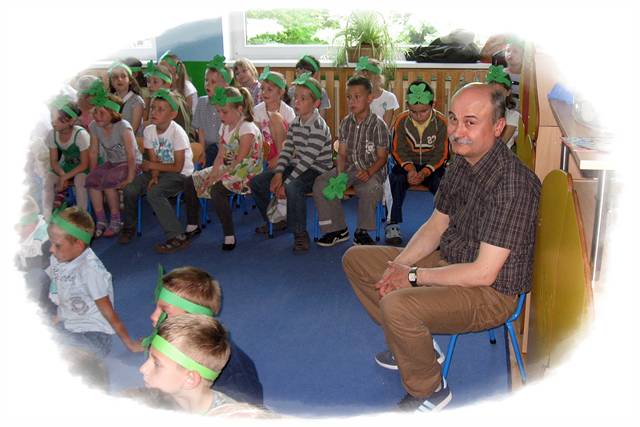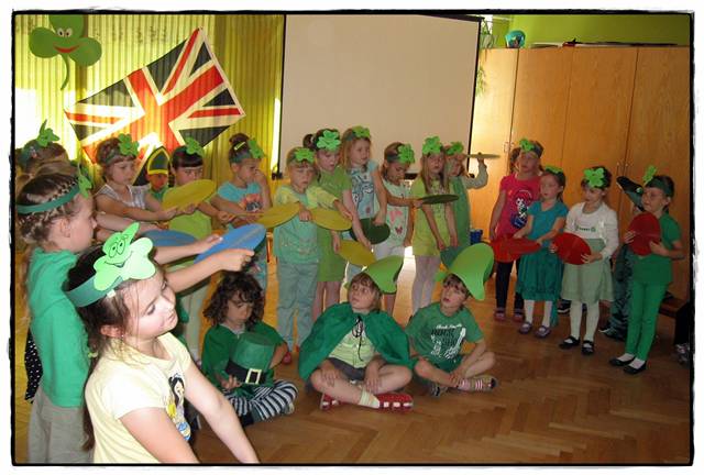 Dzieci z Przedszkola "Krasnal Hałabała" w Kaźmierzu wraz z nauczycielką j. angielskiego zaprosiły swoje koleżanki i kolegów z klas I a i I b Szkoły Podstawowej w Kaźmierzu do odkrywania Zjednoczonego Królestwa Wielkiej Brytanii i Irlandii Północnej. Młodsze dzieci przygotowały uczniom zielone koniczyny - symbol Irlandii, która była głównym celem podróży. Dzieci obejrzały prezentacje multimedialną i aktywnie uczestniczyły w zabawach z muzyką. Absolwenci przedszkola odkryli kilka ciekawostek na temat obcojęzycznego kraju, a także przypomnieli sobie piosenki śpiewane podczas ubiegłorocznych zajęć w przedszkolu. W oczach niektórych dzieci można było zobaczyć jak bardzo tęsknią za pobytem w przedszkolu - beztroską zabawą. Cieszymy się, że mogliśmy razem spędzić ten czas.
