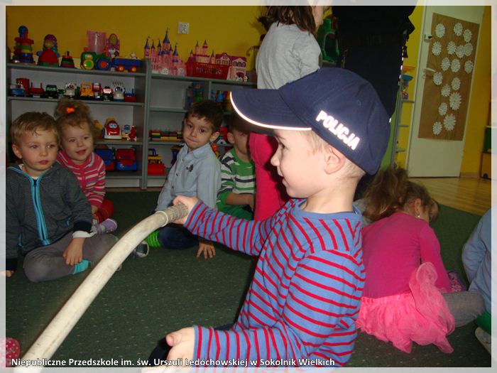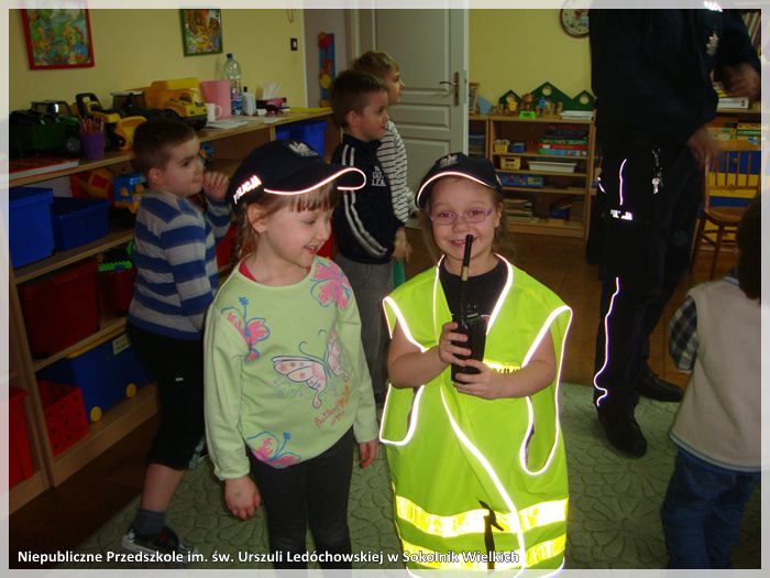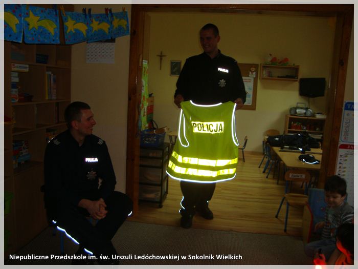 21 stycznia 2015 r., dzieci z Niepublicznego Przedszkola im. św. Urszuli Ledóchowskiej z Sokolnik Wielkich miały możliwość uczestniczenia w ciekawym spotkaniu z policjantami z Kaźmierza. Goście poprowadzili z przedszkolakami rozmowę kierowaną o bezpieczeństwie w ruchu drogowym oraz przestrzegli przed tym, by nie obdarzać zaufaniem obcych im ludzi. Panowie zapoznali dzieci również z policyjnym ekwipunkiem.