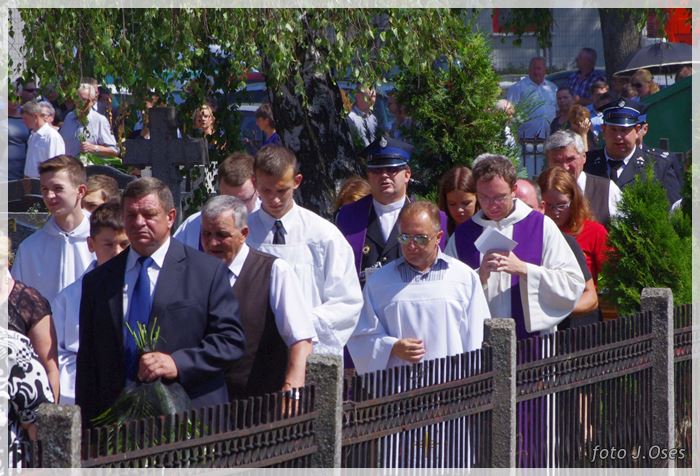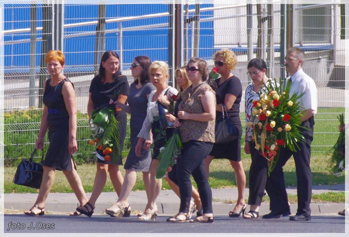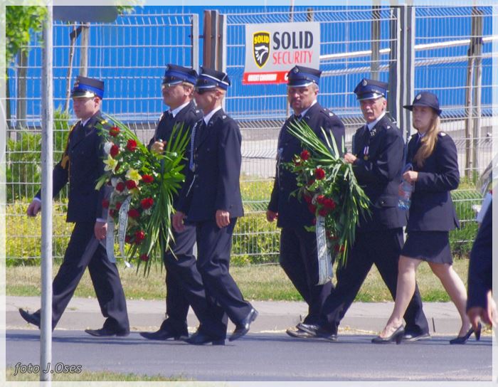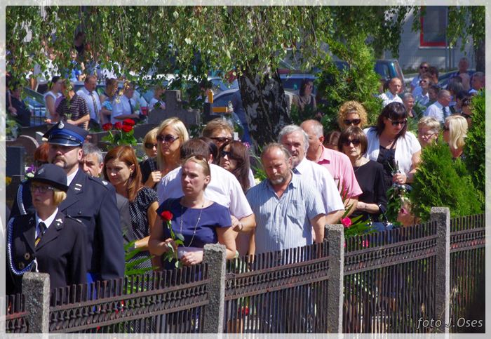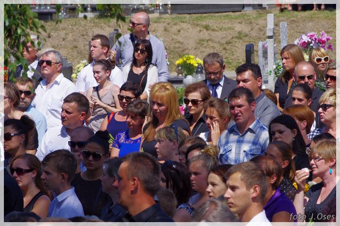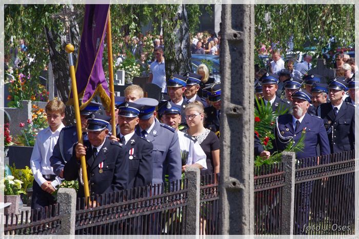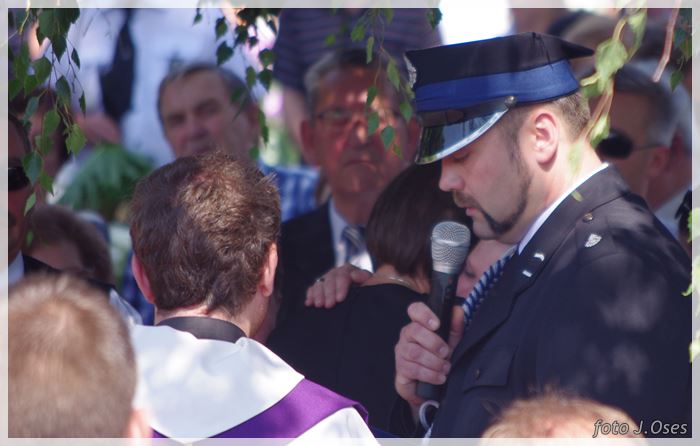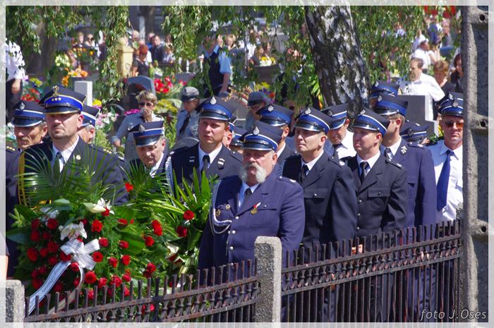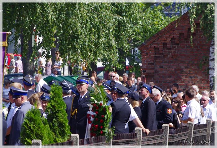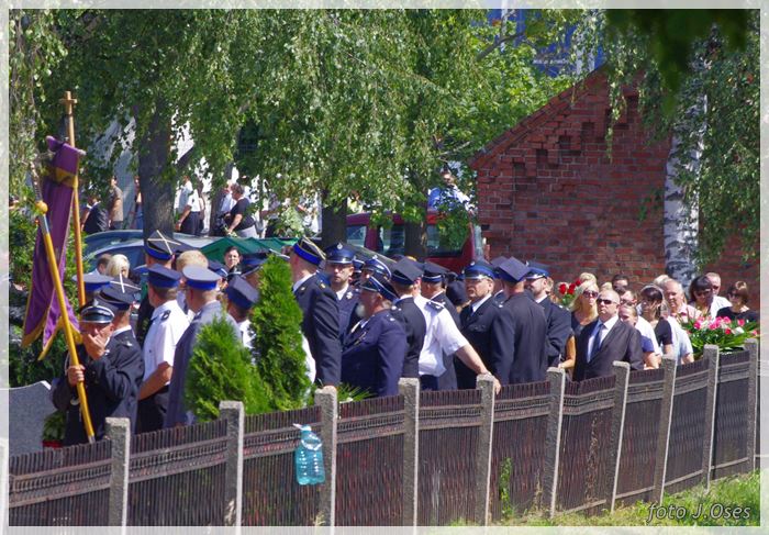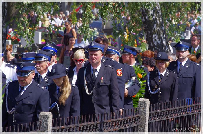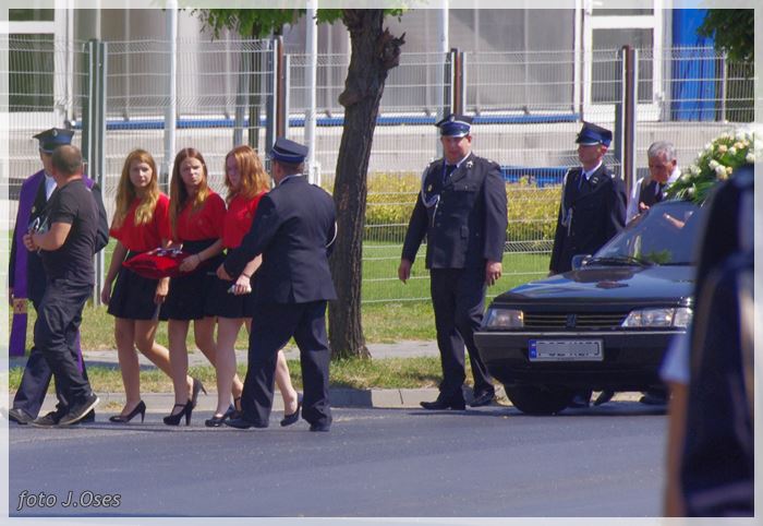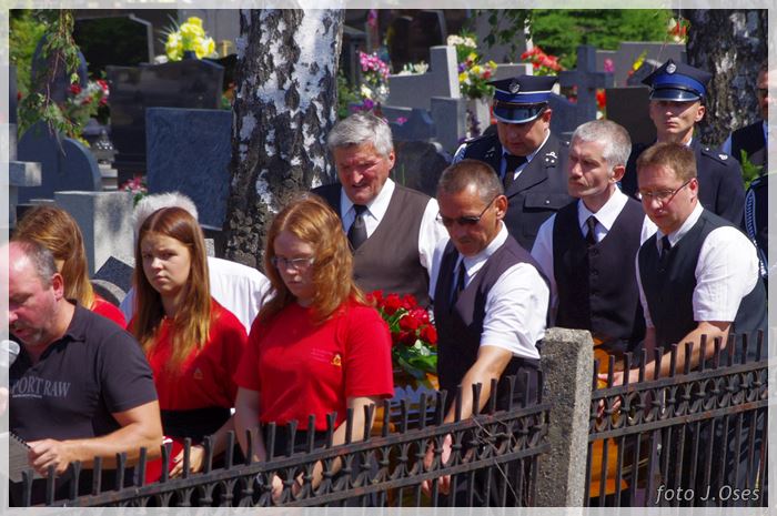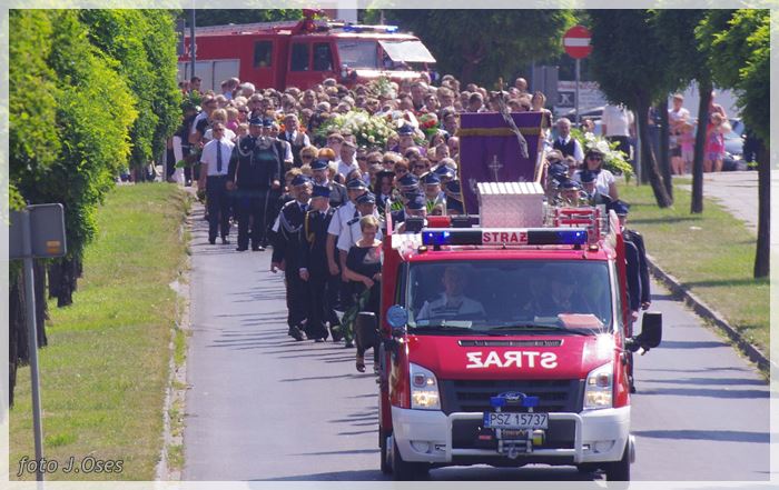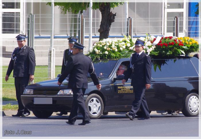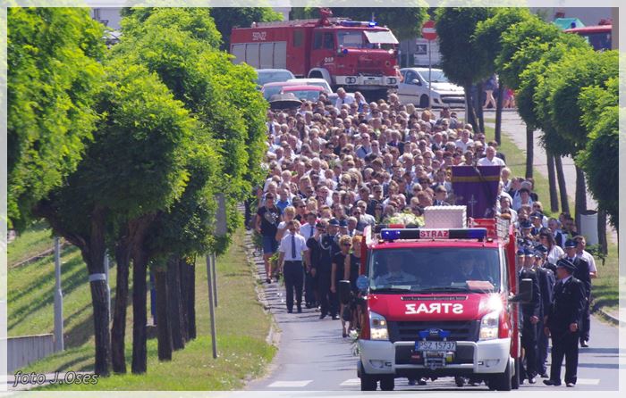 W uroczystościach pogrzebowych uczestniczyły licznie poczty sztandarowe, na których czele były poczty OSP Kaźmierz i Gimnazjum im. Adama Mickiewicza w Kaźmierzu. W swojej homilii ks. Maciej zwrócił również uwagę na to jak pogodnym, zawsze uśmiechniętym, obdarzonym ponadprzeciętnym poczuciem humoru był zmarły Andrzej. Po mszy św. tłum uczestników uroczystości pogrzebowej odprowadził ciało zmarłego na miejsce wiecznego spoczynku, na cmentarzu parafialnym w Kaźmierzu. Nad grobem krótkie słowo pożegnania wygłosili zastępca dyrektora gimnazjum p. Małgorzata Nowak i w imieniu strażaków druh Paweł Góralczyk. Przypomnę, że śp. Andrzej Nowacki w szeregi OSP Kaźmierz wstąpił w roku 1988. Jako młody adept pożarnictwa przeszedł wszystkie szczeble „drabiny pożarniczej” poczynając od strażaka poprzez mechanika-kierowcę, ratownika technicznego, dowódcę, ratownika medycznego. W latach 2001-2011 pełnił funkcję skarbnika jednostki. W roku 2011 powierzono mu funkcję prezesa jednostki OSP Kaźmierz. Za swoją dzielną i ofiarną postawę otrzymał odznaczenia; „STRAŻAK WZOROWY”, „ZA WYSŁUGĘ 25 LAT”, brązowy, srebrny i złoty medal „ZA ZASŁUGI DLA POŻARNICTWA”, „Medal za udział w akcji gaszenia lasów na Dziewiczej Górze”. Za prezesury druha Andrzeja otworzyła się nowa karta w historii OSP Kaźmierz. Miał wiele pomysłów na to jak powinna wyglądać organizacja jednostki w obecnych czasach. Druhowie strażacy z OSP Kaźmierz zapewniają, że dalej kroczyć będą wskazaną przez swojego dotychczasowego prezesa drogą.