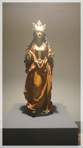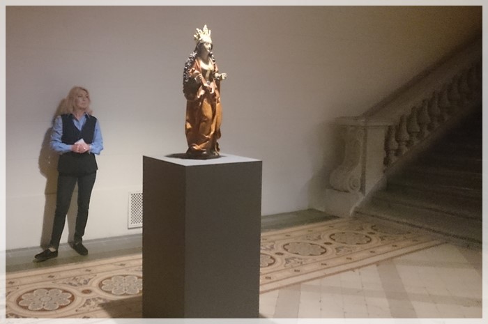 Tak właśnie nazwano figurę, która na co dzień zdobi zwieńczenie naszego ołtarza. Według dokumentacji rzeźba przedstawia św. Elżbietę, ale według tradycji przekazywanej przez miejscową ludność figura ma przedstawiać św. Helenę. Jeszcze inni mieszkańcy zwłaszcza ci związani z kaźmierskim chórem „Moniuszko” przekonani są, że figura przedstawia ich patronkę św. Cecylię. Późnogotycka polichromowana rzeźba wykonana z drewniana, pochodzi z około 1530 roku. Otwarcia wystawy dokonał w dniu 9 kwietnia 2016 r., Przewodniczący Konferencji Episkopatu Polski Arcybiskup Stanisław Gądecki Metropolita Poznański. Zbiory można oglądać do 17 lipca br.