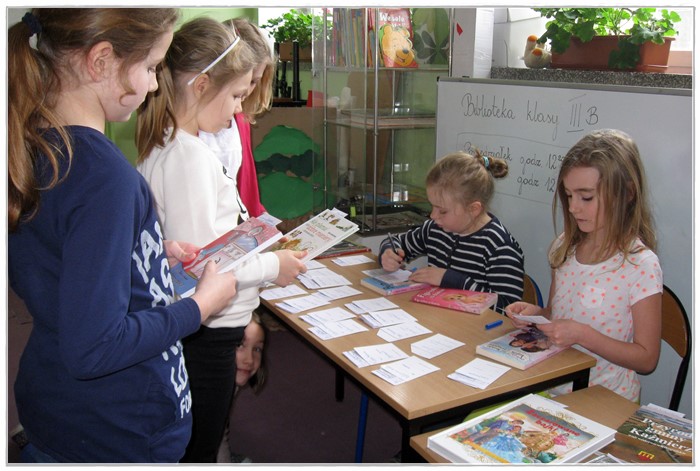 Obserwując zainteresowanie czytaniem książek i częstotliwość odwiedzania bibliotek przed dzieci, już w roku szkolnym 2014-2015, zwrócono uwagę rodziców kl. III b na niechęć, z jaką większość dzieci sięga po lektury. Zaproponowano więc stworzenie klasowej biblioteczki, w której dzięki współpracy z rodzicami znalazły się najnowsze pozycje książkowe udostępnione przez uczniów. Biblioteka klasowa obecnie prowadzona jest wyłącznie przez dzieci – to one są za nią odpowiedzialni, rejestrują wypożyczane książki, zapisują dane na oryginalnych kartach, prezentują ciekawe książki w gablocie na szkolnym korytarzu. Istotny wpływ na zainteresowanie dzieci literaturą miała akcja pt. „Książka – moja wakacyjna towarzyszka” zaproponowana przez przewodnicząca Rady Rodziców – Magdalenę Kaźmierczak.